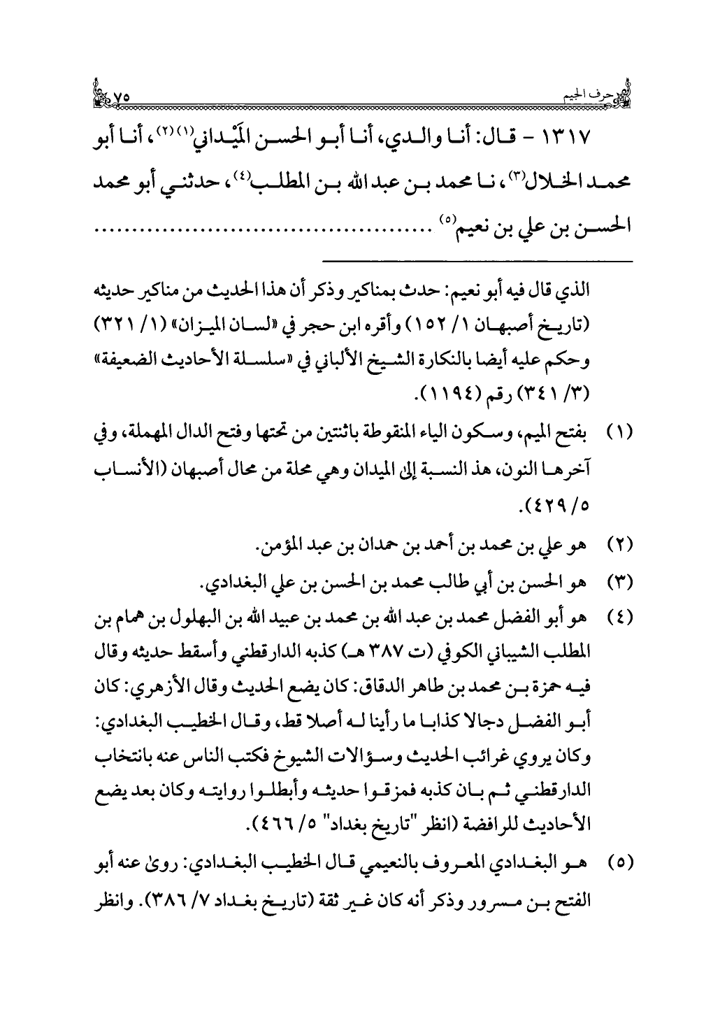 ١٣١٧ - قال: أنا والدي، أنا أبو الحسن المَيْداني (¬١) (¬٢)، أنا أبو محمد الخلال (¬٣)، نا محمد بن عبد الله بن المطلب (¬٤)، حدثني أبو محمد الحسن بن علي بن نعيم (¬٥). . . . . . . . . . . . . . . . . .