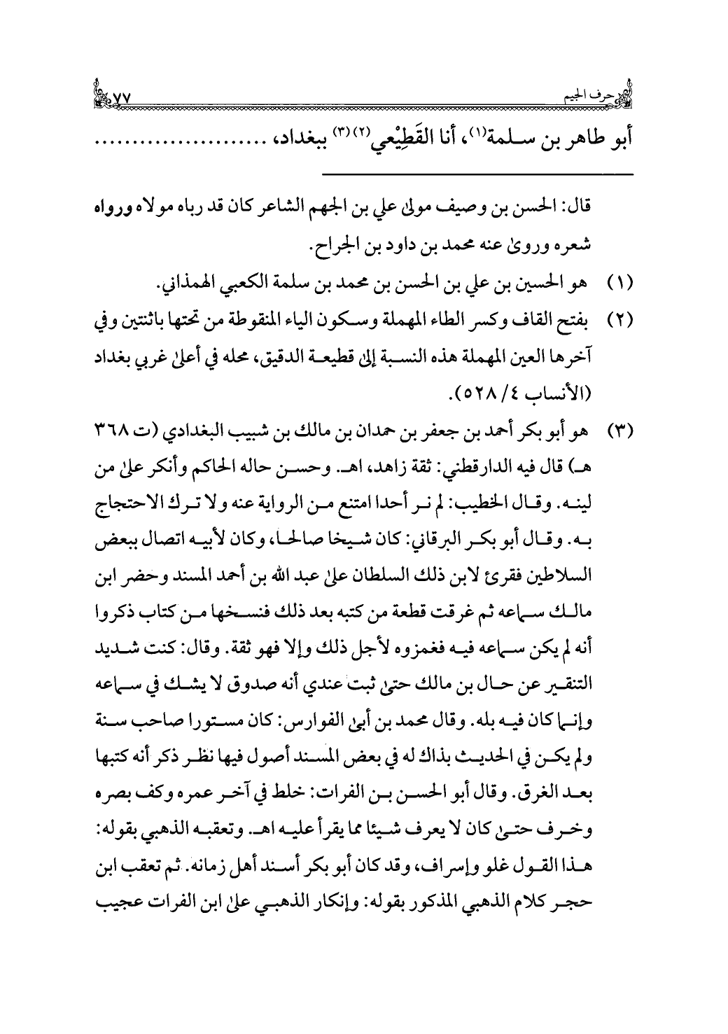 (¬٢) بفتح القاف وكسر الطاء المهملة وسكون الياء المنقوطة من تحتها باثنتين وفي آخرها العين المهملة هذه النسبة إلى قطيعة الدقيق، محله في أعلى غربي بغداد (الأنساب ٤/ ٥٢٨).