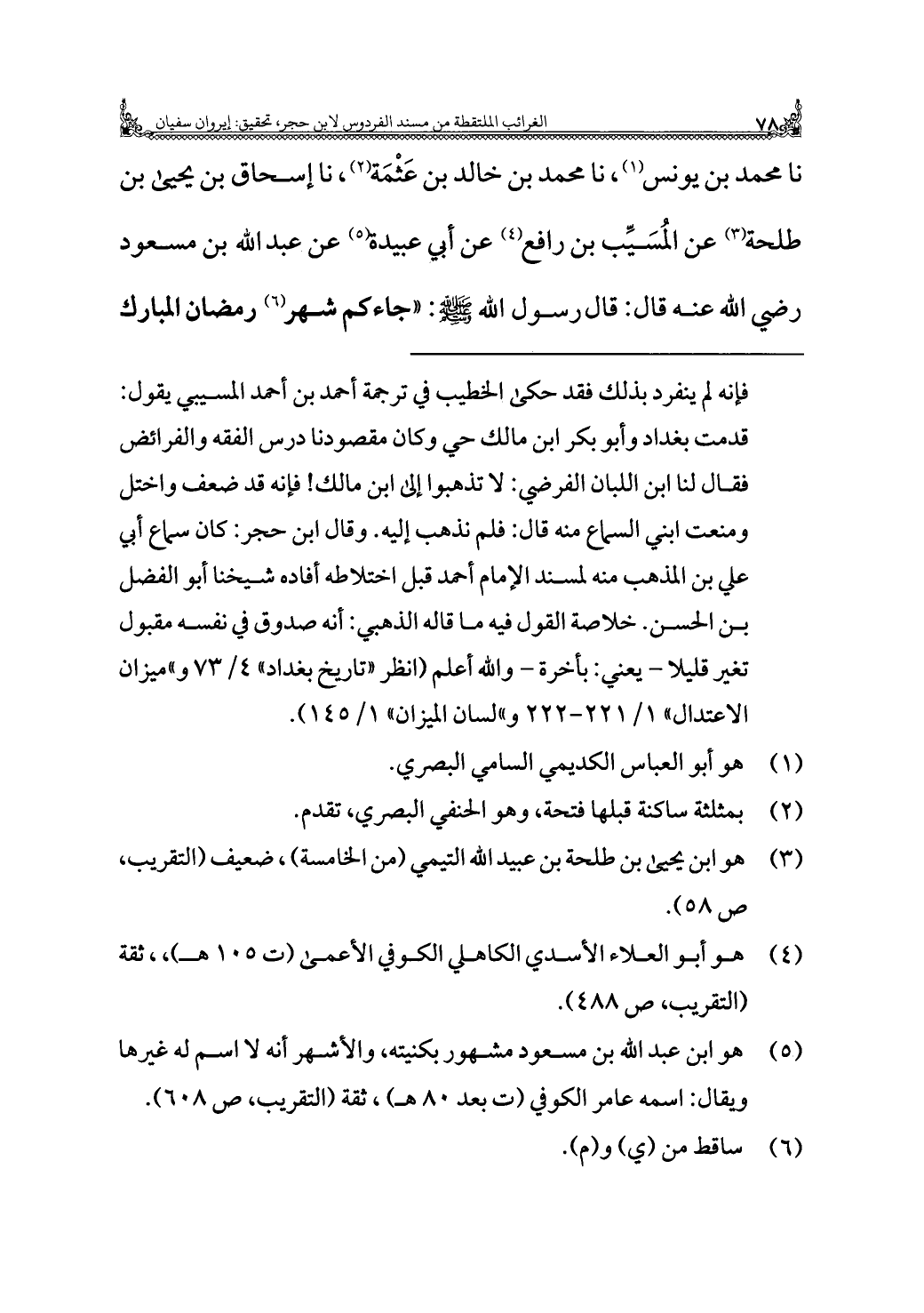 نا محمد بن يونس (¬١)، نا محمد بن خالد بن عَثْمَة (¬٢)، نا إسحاق بن يحيى بن طلحة (¬٣) عن المُسَيِّب بن رافع (¬٤) عن أبي عبيدة (¬٥) عن عبد الله بن مسعود رضي الله عنه قال: قال رسول الله - صلى الله عليه وسلم -: "جاءكم شهر (¬٦) رمضان المبارك