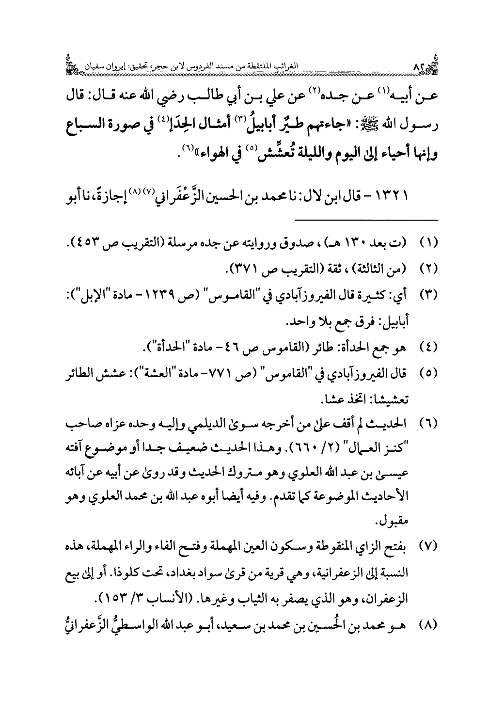 عن أبيه (¬١) عن جده (¬٢) عن علي بن أبي طالب رضي الله عنه قال: قال رسول الله - صلى الله عليه وسلم -: "جاءتهم طيرٌ أبابيلُ (¬٣) أمثال الحِدَإ (¬٤) في صورة السباع وإنها أحياء إلى اليوم والليلة تُعشِّش (¬٥) في الهواء" (¬٦).