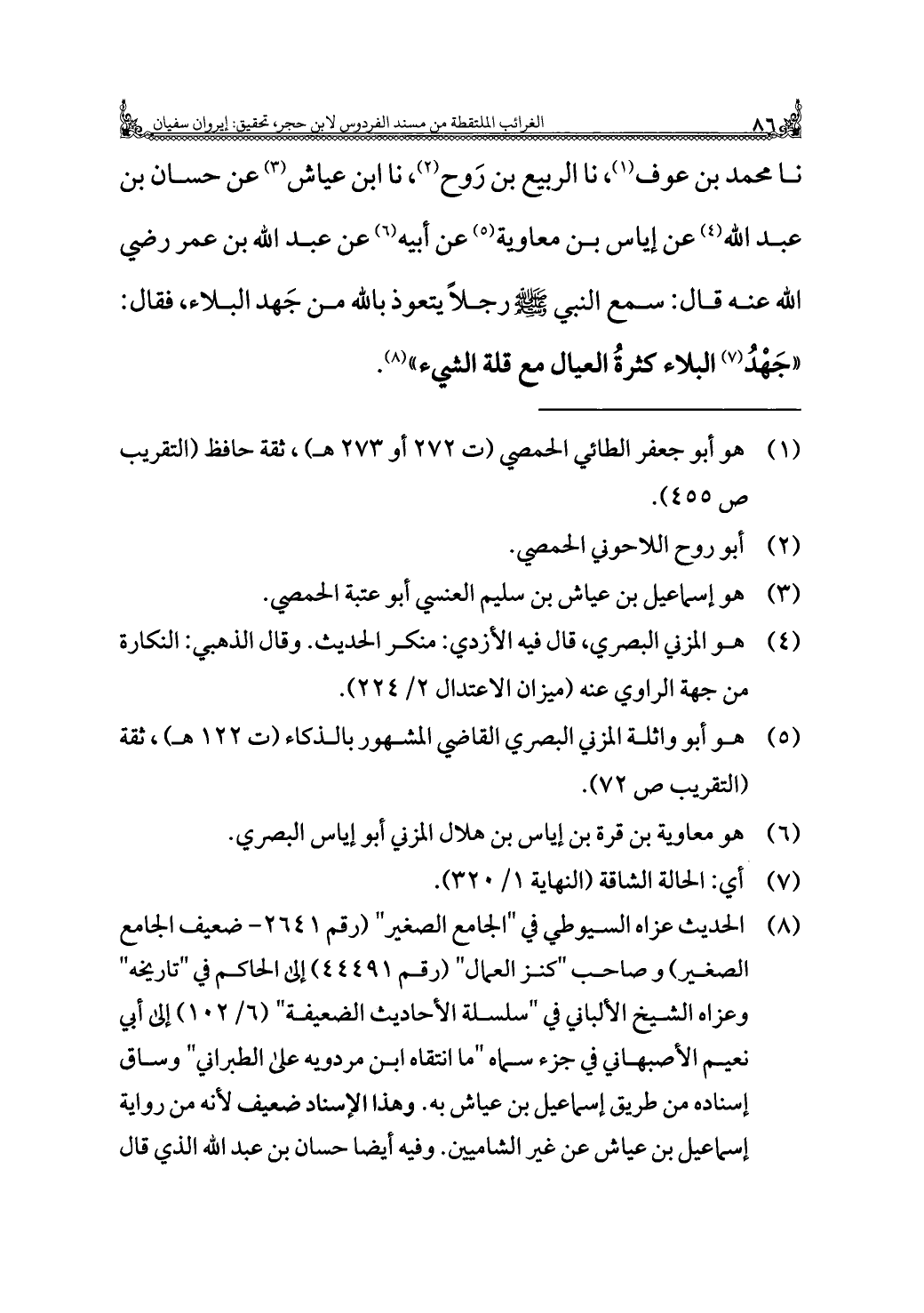(¬٨) الحديث عزاه السيوطي في "الجامع الصغير" (رقم ٢٦٤١ - ضعيف الجامع الصغير) وصاحب "كنز العمال" (رقم ٤٤٤٩١) إلى الحاكم في "تاريخه" وعزاه الشيخ الألباني في "سلسلة الأحاديث الضعيفة" (٦/ ١٠٢) إلى أبي نعيم الأصبهاني في جزء سماه "ما انتقاه ابن مردويه على الطبراني" وساق إسناده من طريق إسماعيل بن عياش به. وهذا الإسناد ضعيف لأنه من رواية إسماعيل بن عياش عن غير الشاميين. وفيه أيضًا حسان بن عبد الله الذي قال =