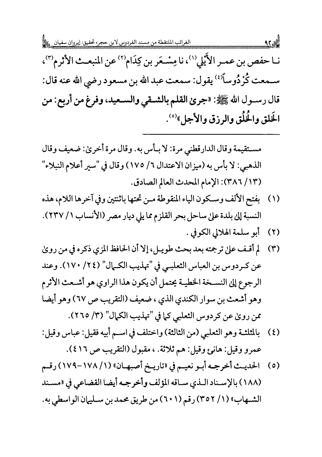 نا حفص بن عمر الأَيْلي (¬١)، نا مِسْعَر بن كِدَام (¬٢) عن المنبعث الأثرم (¬٣)، سمعت كُرْدُوسًا (¬٤) يقول: سمعت عبد الله بن مسعود رضي الله عنه قال: قال رسول الله - صلى الله عليه وسلم -: "جرى القلم بالشقي والسعيد، وفرغ من أربع: من الخَلق والخُلُق والرزق والأجل" (¬٥).
