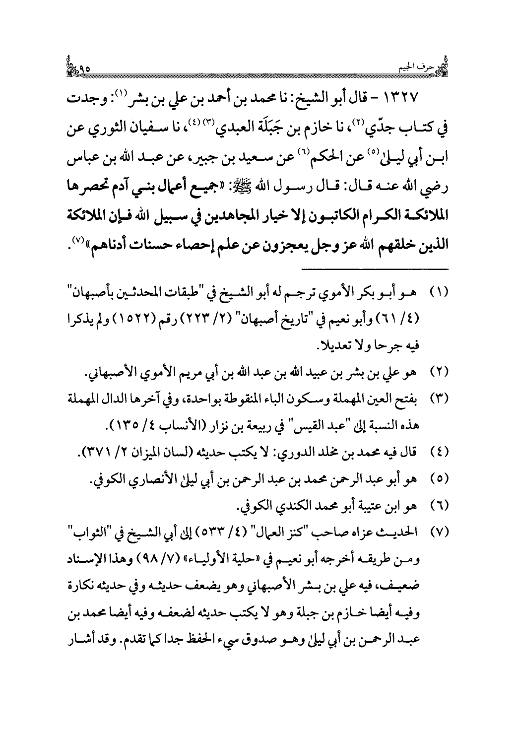 ١٣٢٧ - قال أبو الشيخ: نا محمد بن أحمد بن علي بن بشر (¬١): وجدت في كتاب جدّي (¬٢)، نا خازم بن جَبَلَة العبدي (¬٣) (¬٤)، نا سفيان الثوري عن ابن أبي ليلى (¬٥) عن الحكم (¬٦) عن سعيد بن جبير، عن عبد الله بن عباس رضي الله عنه قال: قال رسول الله - صلى الله عليه وسلم -: "جميع أعمال بني آدم تحصرها الملائكة الكرام الكاتبون إلا خيار المجاهدين في سبيل الله فإن الملائكة الذين خلقهم الله عز وجل يعجزون عن علم إحصاء حسنات أدناهم" (¬٧).