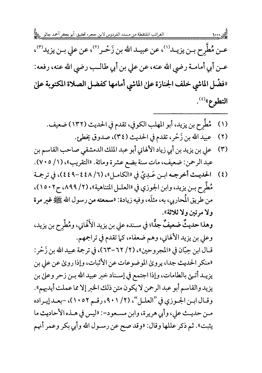 عن مُطَّرِح بن يزيد (¬١)، عن عبيد الله بن زَحْر (¬٢)، عن على بن يزيد (¬٣)، عن أبي أمامة رضي الله عنه، عن علي بن أبي طالب رضي الله عنه، رفعه: "فضْل الماشي خلف الجنازة على الماشي أمامها كلفضل الصلاة المكتوبة على التطوع" (¬٤).