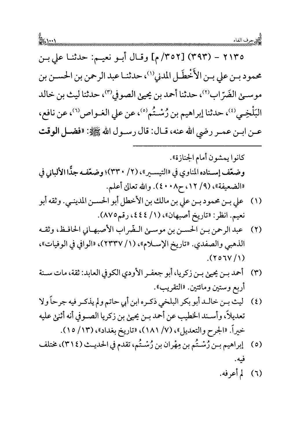 ٢١٣٥ - (٣٩٣) وقال أبو نعيم: حدثنا علي بن محمود بن علي بن الأَخْطَل المدني (¬١)، حدثنا عبد الرحمن بن الحسن بن موسى الضَرّاب (¬٢)، حدثنا أحمد بن يحيى الصوفي (¬٣)، حدثنا ليث بن خالد البَلْخِي (¬٤)، حدثنا إبراهيم بن رُسْتُم (¬٥)، عن علي الغواص (¬٦)، عن نافع، عن ابن عمر رضي الله عنه، قال: قال رسول الله -صلى الله عليه وسلم-: "فضل الوقت