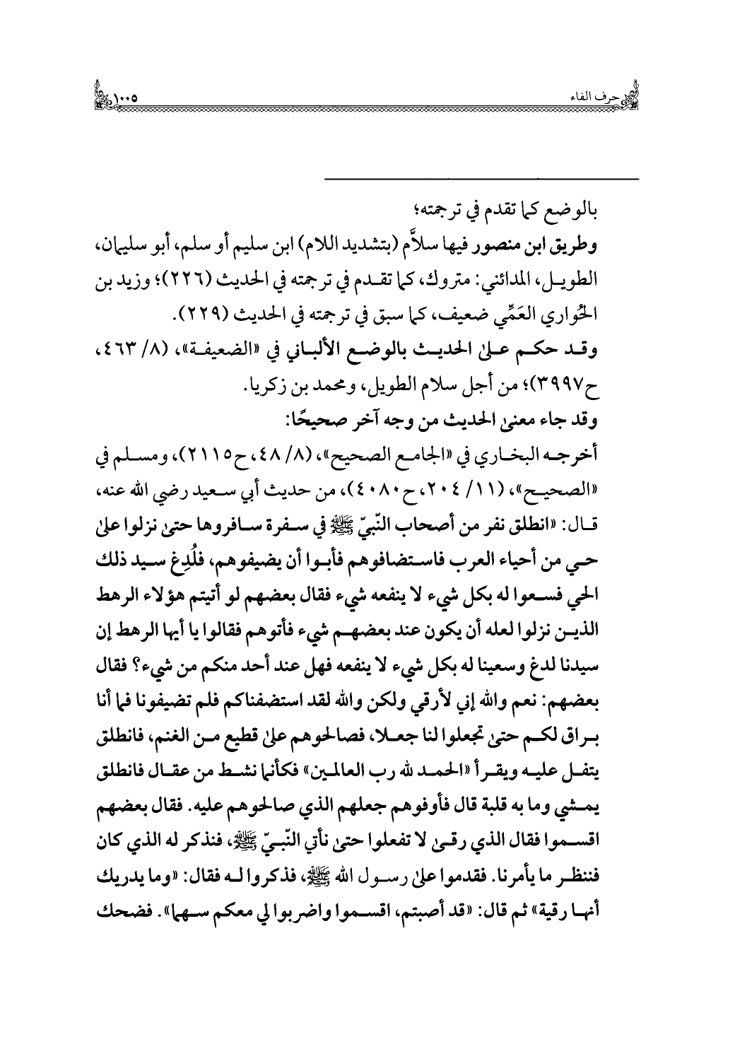 أخرجه البخاري في "الجامع الصحيح"، (٨/ ٤٨، ح ٢١١٥)، ومسلم في "الصحيح"، (١١/ ٢٠٤، ح ٤٠٨٠)، من حديث أبي سعيد رضي الله عنه، قال: "انطلق نفر من أصحاب النّبيّ -صلى الله عليه وسلم- في سفرة سافروها حتى نزلوا على حي من أحياء العرب فاستضافوهم فأبوا أن يضيفوهم، فلُدِغ سيد ذلك الحي فسعوا له بكل شيء لا ينفعه شيء فقال بعضهم لو أتيتم هؤلاء الرهط الذين نزلوا لعله أن يكون عند بعضهم شيء فأتوهم فقالوا يا أيها الرهط إن سيدنا لدغ وسعينا له بكل شيء لا ينفعه فهل عند أحد منكم من شيء؟ فقال بعضهم: نعم والله إني لأرقي ولكن والله لقد استضفناكم فلم تضيفونا فما أنا براق لكم حتى تجعلوا لنا جعلًا، فصالحوهم على قطيع من الغنم، فانطلق يتفل عليه ويقرأ "الحمد لله رب العالمين" فكأنما نشط من عقال فانطلق يمشي وما به قلبة قال فأوفوهم جعلهم الذي صالحوهم عليه. فقال بعضهم اقسموا فقال الذي رقى لا تفعلوا حتى نأتي النّبيّ -صلى الله عليه وسلم-، فنذكر له الذي كان فننظر ما يأمرنا. فقدموا على رسول الله -صلى الله عليه وسلم-، فذكروا له فقال: "وما يدريك أنها رقية" ثمَّ قال: "قد أصبتم، اقسموا واضربوا لي معكم سهما". فضحك