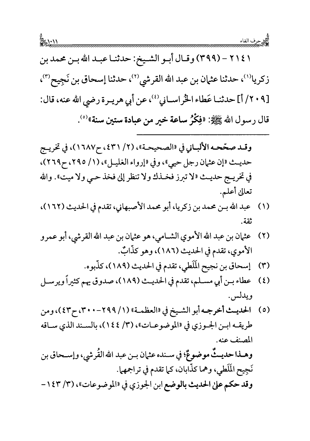 ٢١٤١ - (٣٩٩) وقال أبو الشيخ: حدثنا عبد الله بن محمَّد بن زكريا (¬١)، حدثنا عثمان بن عبد الله القرشي (¬٢)، حدثنا إسحاق بن نَجِيح (¬٣)، [٢٠٩/ أ] حدثنا عَطاء الخُراساني (¬٤)، عن أبي هريرة رضي الله عنه، قال: قال رسول الله -صلى الله عليه وسلم-: "فِكْرُ ساعة خير من عبادة ستين سنة" (¬٥).