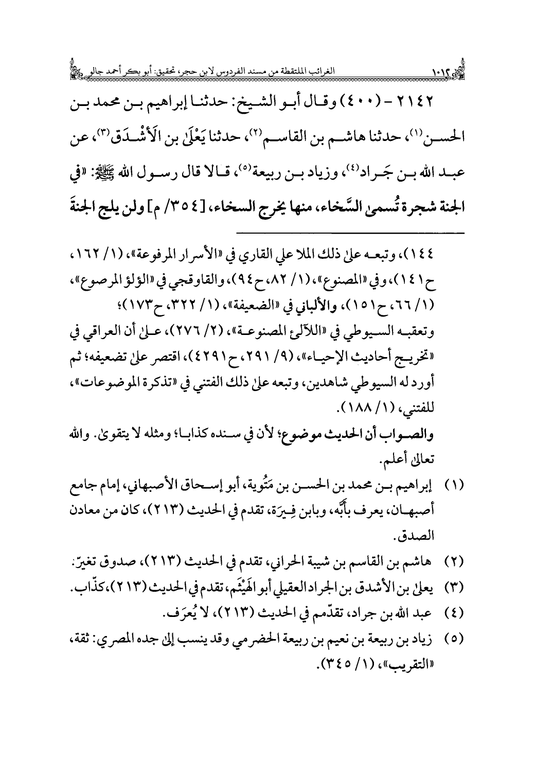 ٢١٤٢ - (٤٠٠) وقال أبو الشيخ: حدثنا إبراهيم بن محمَّد بن الحسن (¬١)، حدثنا هاشم بن القاسم (¬٢)، حدثنا يَعْلَى بن الأشْدَق (¬٣)، عن عبد الله بن جَراد (¬٤)، وزياد بن ربيعة (¬٥)، قالا قال رسول الله -صلى الله عليه وسلم-: "في الجنة شجرة تُسمى السَّخاء، منها يخرج السخاء، [٣٥٤/ م] ولن يلج الجنةَ