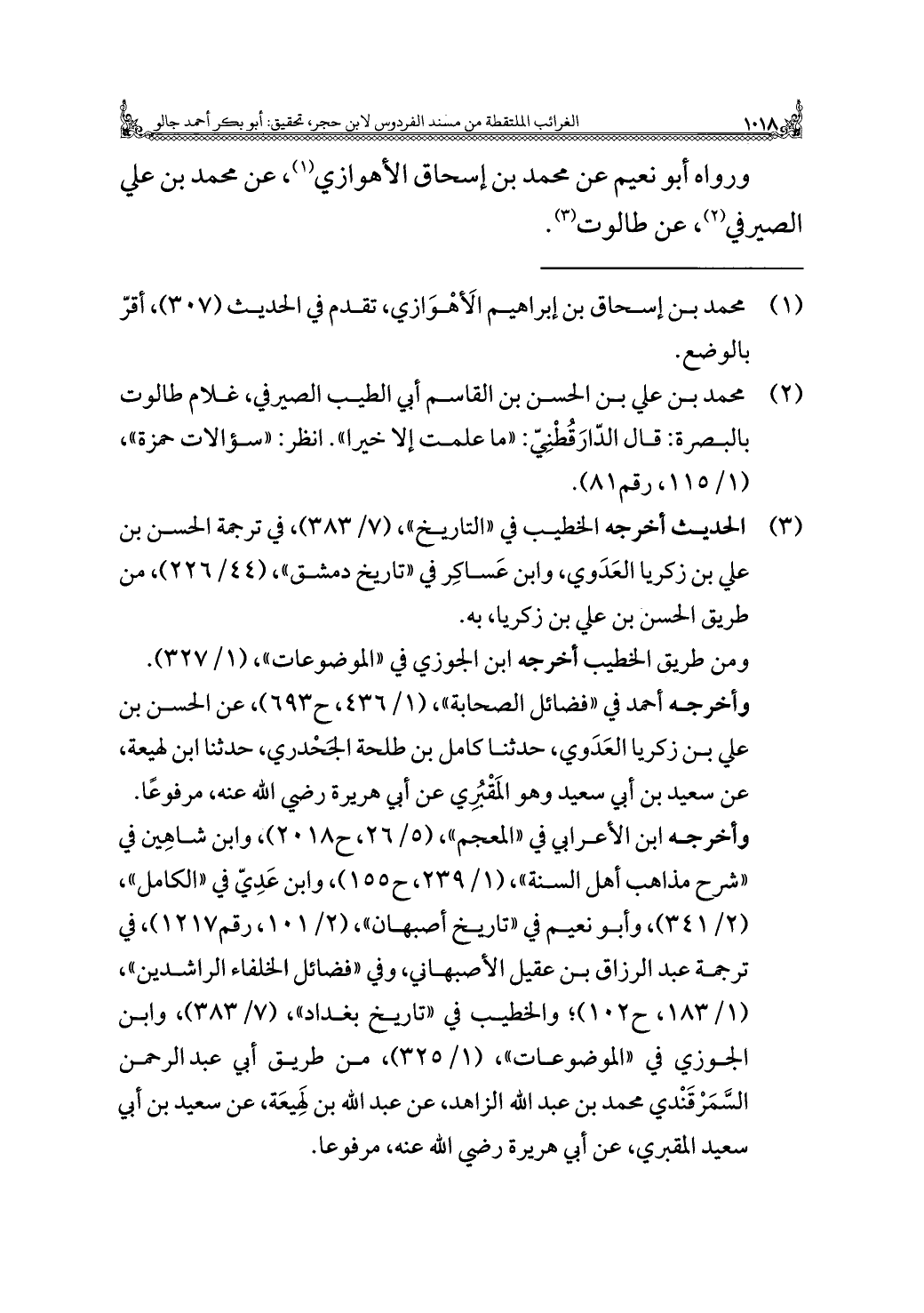 ورواه أبو نعيم عن محمَّد بن إسحاق الأهوازي (¬١)، عن محمَّد بن علي الصيرفي (¬٢)، عن طالوت (¬٣).