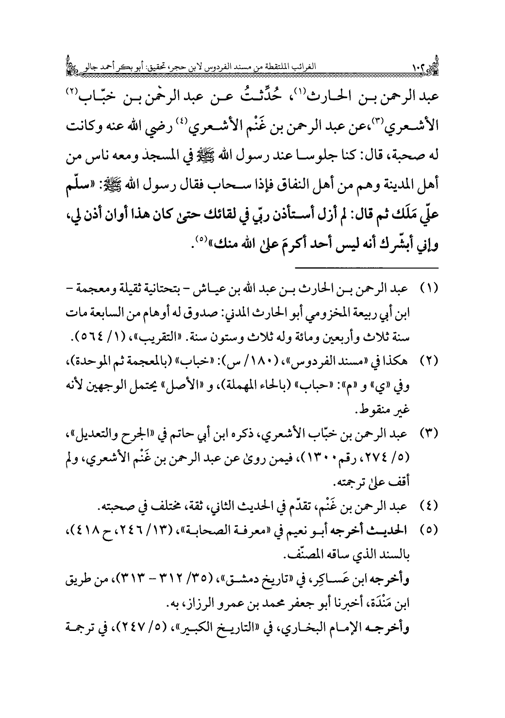 عبد الرحمن بن الحارث (¬١)، حُدِّثتُ عن عبد الرحمن بن خبّاب (¬٢) الأشعري (¬٣)، عن عبد الرحمن بن غَنْم الأشعري (¬٤) رضي اللَّه عنه وكانت له صحبة، قال: كنا جلوسًا عند رسول اللَّه -صلى اللَّه عليه وسلم- في المسجد ومعه ناس من أهل المدينة وهم من أهل النفاق فإذا سحاب فقال رسول اللَّه -صلى اللَّه عليه وسلم-: "سلَّم عليّ مَلَك ثم قال: لم أزل أستاذن ربي في لقائك حتى كان هذا أوان أذن لي، وإني أبشّرك أنه ليس أحد أكرمَ على اللَّه منك" (¬٥).