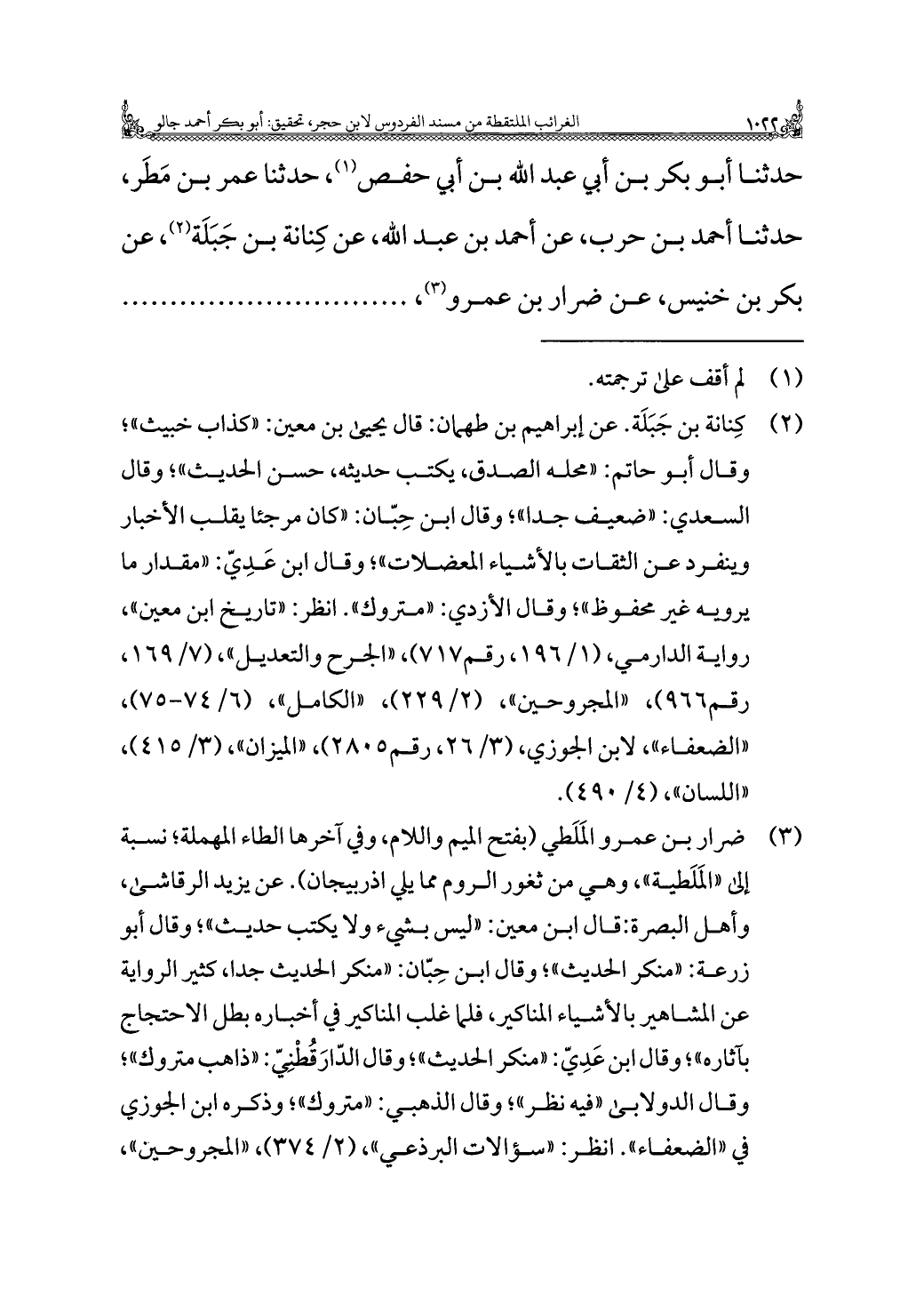 (¬٢) كِنانة بن جَبَلَة. عن إبراهيم بن طهمان: قال يحيى بن معين: "كذاب خبيث"؛ وقال أبو حاتم: "محله الصدق، يكتب حديثه، حسن الحديث"؛ وقال السعدي: "ضعيف جدًا"؛ وقال ابن حِبّان: "كان مرجئًا يقلب الأخبار وينفرد عن الثقات بالأشياء المعضلات"؛ وقال ابن عَدِيّ: "مقدار ما يرويه غير محفوظ"؛ وقال الأزدي: "متروك". انظر: "تاريخ ابن معين"، رواية الدارمي، (١/ ١٩٦، رقم ٧١٧)، "الجرح والتعديل"، (٧/ ١٦٩، رقم ٩٦٦)، "المجروحين"، (٢/ ٢٢٩)، "الكامل"، (٦/ ٧٤ - ٧٥)، "الضعفاء"، لابن الجوزي، (٣/ ٢٦، رقم ٢٨٠٥)، "الميزان"، (٣/ ٤١٥)، "اللسان"، (٤/ ٤٩٠).