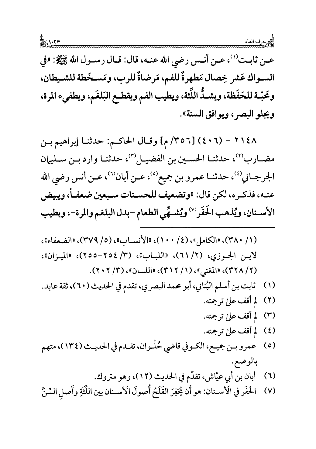 ٢١٤٨ - (٤٠٦) وقال الحاكم: حدثنا إبراهيم بن مضارب (¬٢)، حدثنا الحسين بن الفضيل (¬٣)، حدثنا وارد بن سليمان الجرجاني (¬٤)، حدثنا عمرو بن جميع (¬٥)، عن أبان (¬٦)، عن أنس رضي الله عنه، فذكره، لكن قال: "وتضعيف للحسنات سبعين ضعفًا، ويبيض الأسنان، ويُذهب الحَفَر (¬٧) ويُشهِّي الطعام -بدل البلغم والمرة-، ويطيب