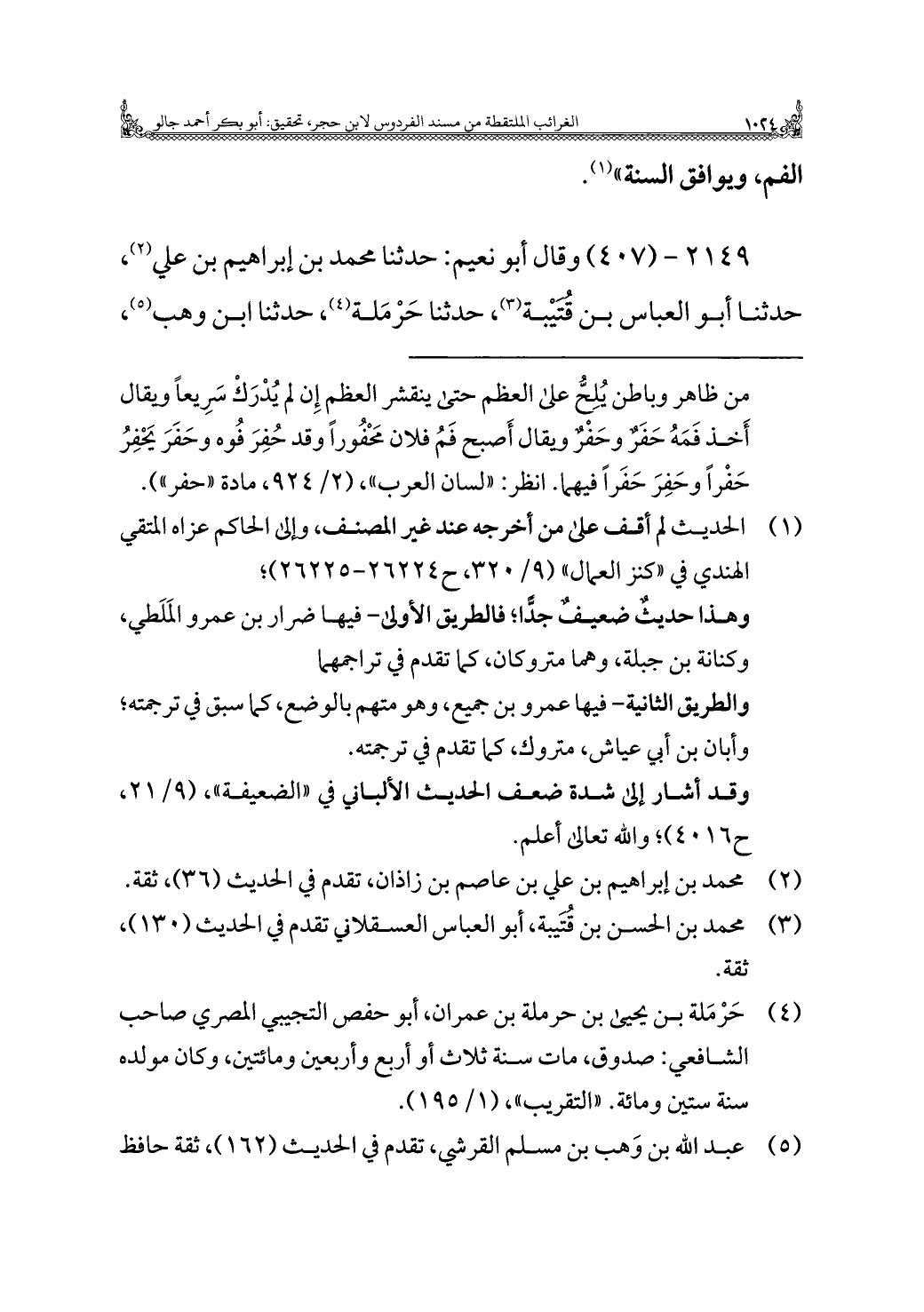 ٢١٤٩ - (٤٠٧) وقال أبو نعيم: حدثنا محمَّد بن إبراهيم بن علي (¬٢)، حدثنا أبو العباس بن قُتَيْبة (¬٣)، حدثنا حَرْمَلة (¬٤)، حدثنا ابن وهب (¬٥)،