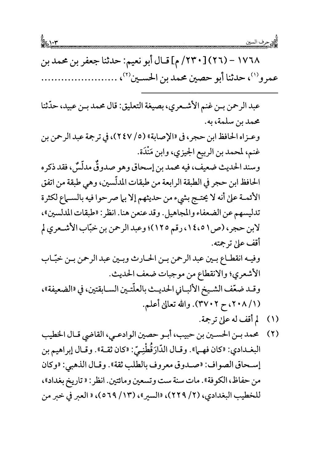 ١٧٦٨ - (٢٦) قال أبو نعيم: حدثنا جعفر بن محمد بن عمرو (¬١)، حدثنا أبو حصين محمد بن الحسين (¬٢)، . . . . . .