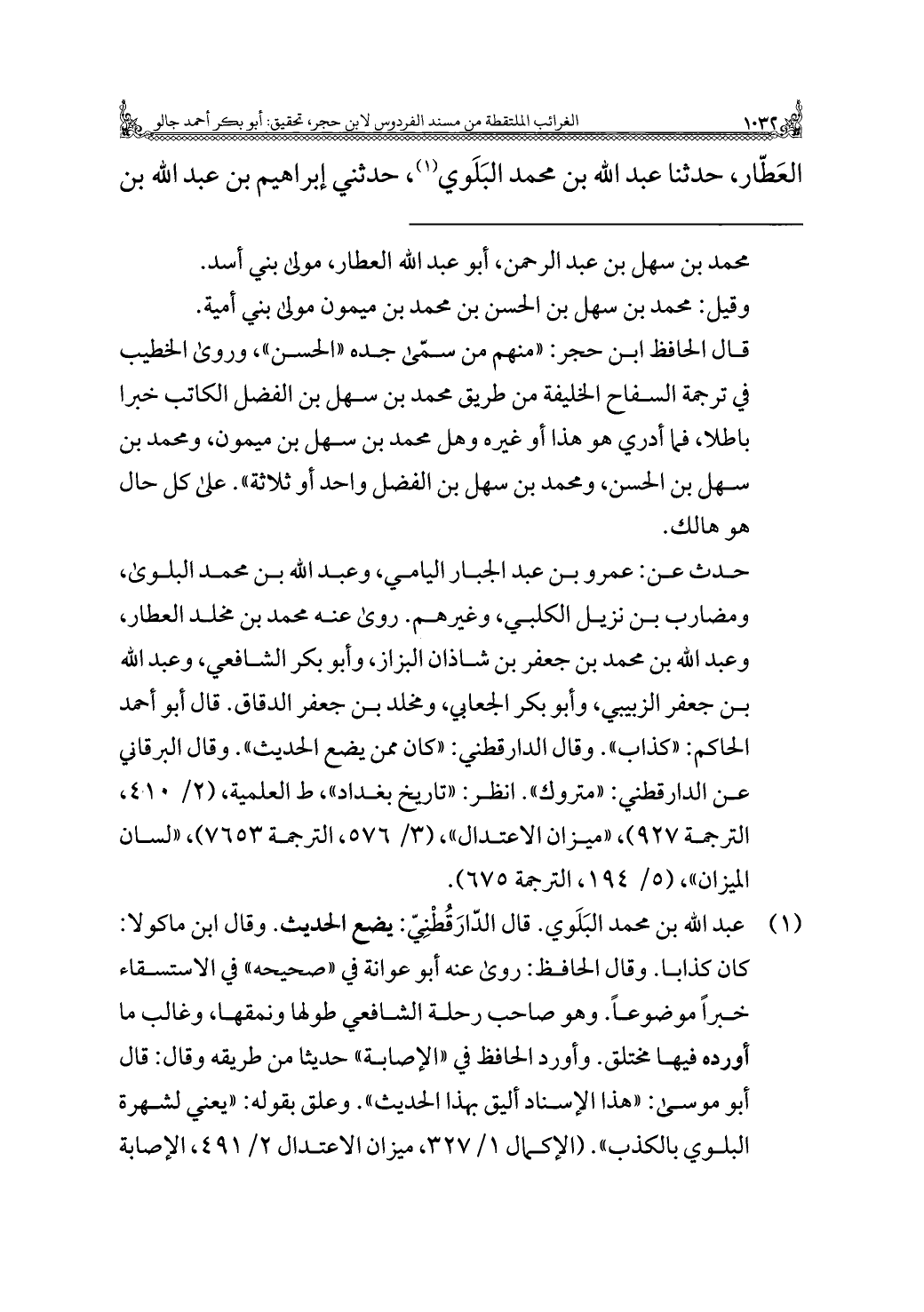 (¬١) عبد الله بن محمَّد البَلَوي. قال الدّارَقطْنِيّ: يضع الحديث. وقال ابن ماكولا: كان كذابًا. وقال الحافظ: روى عنه أبو عوانة في "صحيحه" في الاستسقاء خبرًا موضوعًا. وهو صاحب رحلة الشافعي طولها ونمقها، وغالب ما أورده فيها مختلق. وأورد الحافظ في "الإصابة" حديثًا من طريقه وقال: قال أبو موسى: "هذا الإسناد أليق بهذا الحديث". وعلق بقوله: "يعني لشهرة البلوي بالكذب". (الإكمال ١/ ٣٢٧، ميزان الاعتدال ٢/ ٤٩١، الإصابة