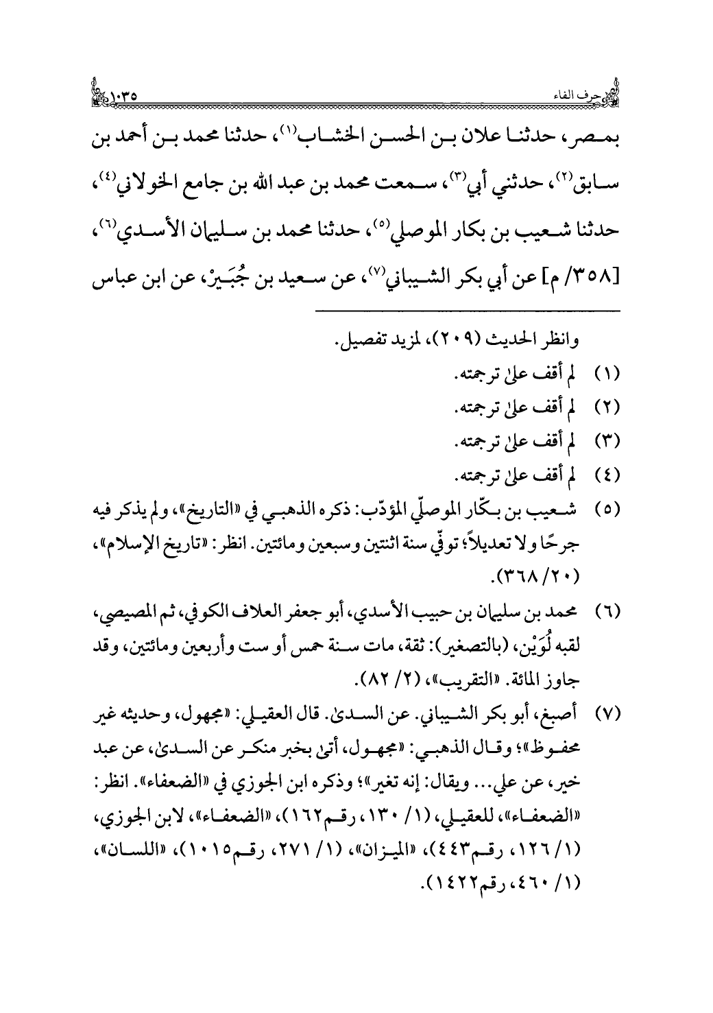 (¬٧) أصبغ، أبو بكر الشيباني. عن السدى. قال العقيلي: "مجهول، وحديثه غير محفوظ"؛ وقال الذهبي: "مجهول، أتى بخبر منكر عن السدى، عن عبد خير، عن علي ... ويقال: إنه تغير"؛ وذكره ابن الجوزي في "الضعفاء". انظر: "الضعفاء"، للعقيلي، (١/ ١٣٠، رقم ١٦٢)، "الضعفاء"، لابن الجوزي، (١/ ١٢٦، رقم ٤٤٣)، "الميزان"، (١/ ٢٧١، رقم ١٠١٥)، "اللسان"، (١/ ٤٦٠، رقم ١٤٢٢).