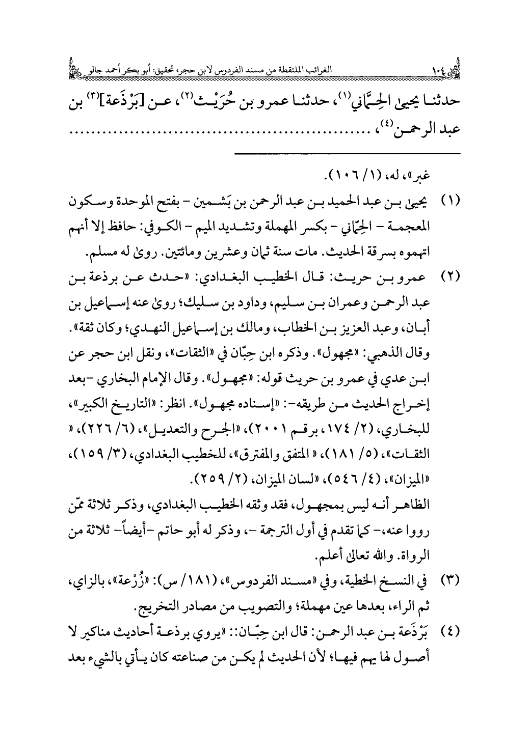 (¬٢) عمرو بن حريث: قال الخطيب البغدادي: "حدث عن برذعة بن عبد الرحمن وعمران بن سليم، وداود بن سليك؛ روى عنه إسماعيل بن أبان، وعبد العزيز بن الخطاب، ومالك بن إسماعيل النهدي؛ وكان ثقة". وقال الذهبي: "مجهول". وذكره ابن حِبّان في "الثقات"، ونقل ابن حجر عن ابن عدي في عمرو بن حريث قوله: "مجهول". وقال الإِمام البخاري -بعد إخراج الحديث من طريقه-: "إسناده مجهول". انظر: "التاريخ الكبير"، للبخاري، (٢/ ١٧٤، برقم ٢٠٠١)، "الجرح والتعديل"، (٦/ ٢٢٦)، "الثقات"، (٥/ ١٨١)، "المتفق والمفترق"، للخطيب البغدادي، (٣/ ١٥٩)، "الميزان"، (٤/ ٥٤٦)، "لسان الميزان" (٢/ ٢٥٩).
