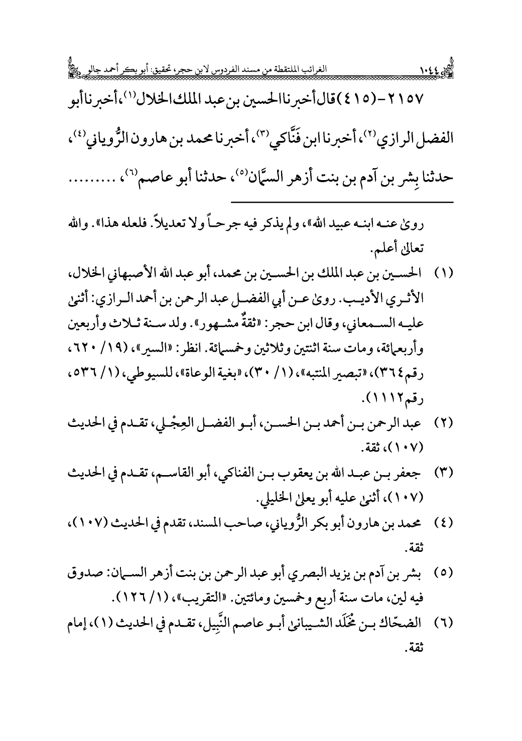 ٢١٥٧ - (٤١٥) قال أخبرنا الحسين بن عبد الملك الخلال (¬١)، أخبرنا أبو الفضل الرازي (¬٢)، أخبرنا ابن فَنَّاكي (¬٣)، أخبرنا محمَّد بن هارون الرُّوياني (¬٤)، حدثنا بِشر بن آدم بن بنت أزهر السمَّان (¬٥)، حدثنا أبو عاصم (¬٦)، . . . . . . . . .