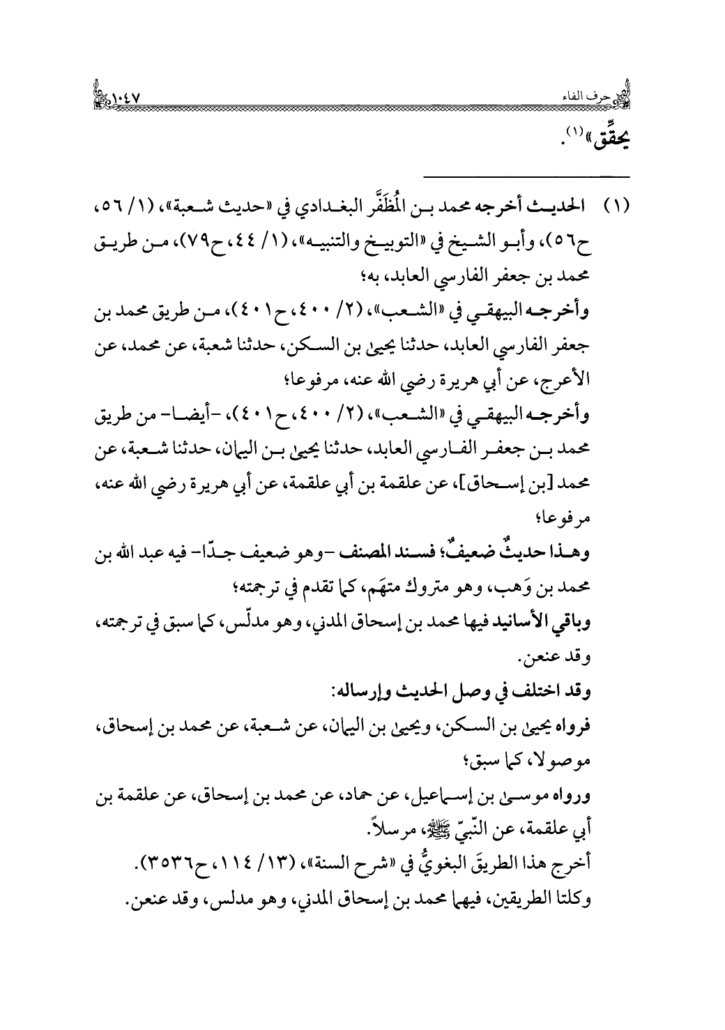 وأخرجه البيهقي في "الشعب"، (٢/ ٤٠٠، ح ٤٠١)، -أيضًا- من طريق محمَّد بن جعفر الفارسي العابد، حدثنا يحيى بن اليمان، حدثنا شعبة، عن محمَّد [بن إسحاق]، عن علقمة بن أبي علقمة، عن أبي هريرة رضي الله عنه، مرفوعًا؛