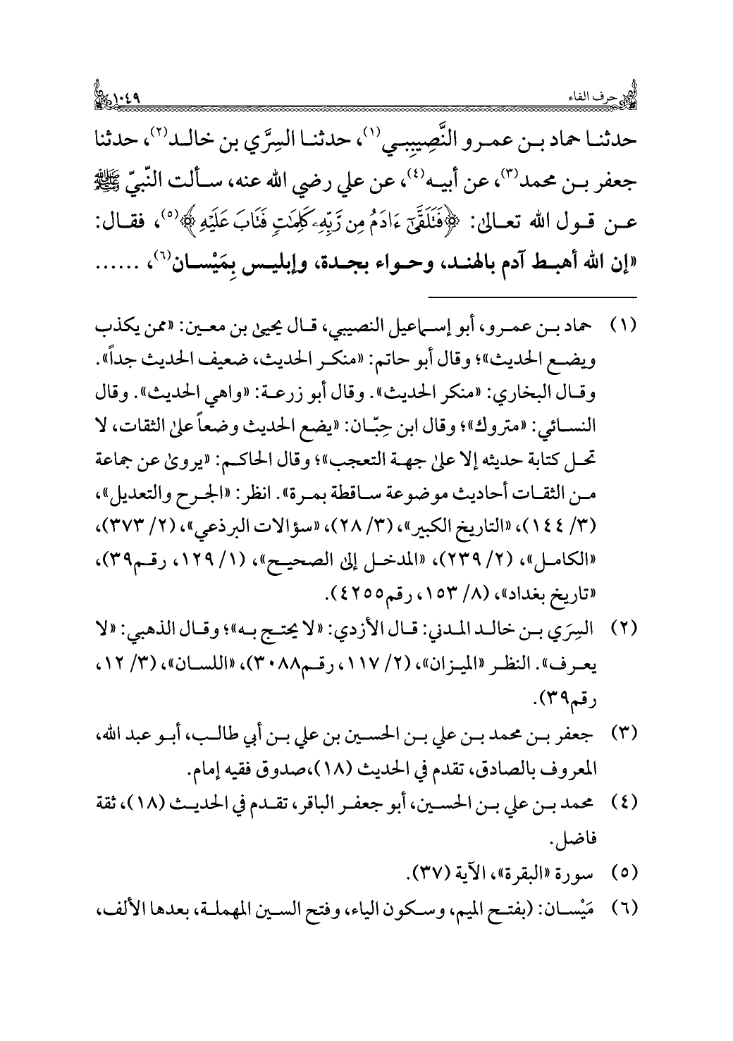 حدثنا حماد بن عمرو النَّصِيبِبي (¬١)، حدثنا السِرَّي بن خالد (¬٢)، حدثنا جعفر بن محمد (¬٣)، عن أبيه (¬٤)، عن علي رضي الله عنه، سألت النّبيّ -صلى الله عليه وسلم- عن قول الله تعالى: {فَتَلَقَّى آدَمُ مِنْ رَبِّهِ كَلِمَاتٍ فَتَابَ عَلَيْهِ} (¬٥)، فقال: "إن الله أهبط آدم بالهند، وحواء بجدة، وإبليس بِمَيْسان (¬٦)، ......
