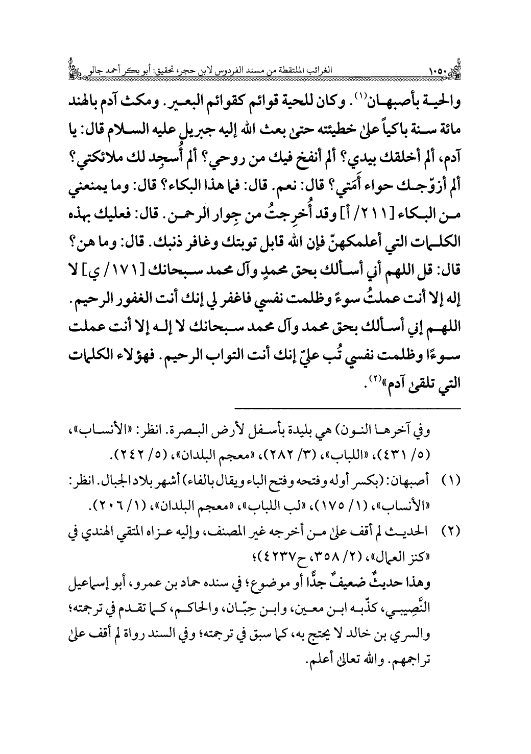 والحية بأصبهان (¬١). وكان للحية قوائم كقوائم البعير. ومكث آدم بالهند مائة سنة باكيًا على خطيئته حتى بعث الله إليه جبريل عليه السلام قال: يا آدم، ألم أخلقك بيدي؟ ألم أنفخ فيك من روحي؟ ألم أسجد لك ملائكتي؟ ألم أزوّجك حواء أَمَتي؟ قال: نعم. قال: فما هذا البكاء؟ قال: وما يمنعني من البكاء وقد أُخرِجتُ من جِوار الرحمن. قال: فعليك بهذه الكلمات التي أعلمكهنّ فإن الله قابل توبتك وغافر ذنبك. قال: وما هن؟ قال: قل اللهم أني أسألك بحق محمدٍ وآل محمد سبحانك لا إله إلا أنت عملتُ سوءً وظلمت نفسي فاغفر لي إنك أنت الغفور الرحيم. اللهم إني أسألك بحق محمد وآل محمد سبحانك لا إله إلا أنت عملت سوءًا وظلمت نفسي تُب عليّ إنك أنت التواب الرحيم. فهؤلاء الكلمات التي تلقى آدم" (¬٢).