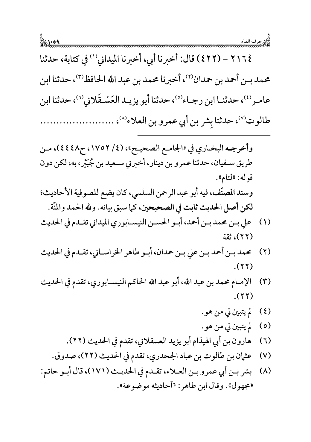 ٢١٦٤ - (٤٢٢) قال: أخبرنا أبي، أخبرنا الميداني (¬١) في كتابة، حدثنا محمد بن أحمد بن حمدان (¬٢)، أخبرنا محمد بن عبد الله الحافظ (¬٣)، حدثنا ابن عامر (¬٤)، حدثنا ابن رجاء (¬٥)، حدثنا أبو يزيد العَسْقَلاني (¬٦)، حدثنا ابن طالوت (¬٧)، حدثنا بِشر بن أبي عمرو بن العلاء (¬٨)، .......................