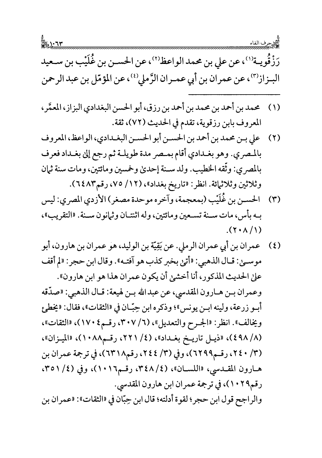 وعمران بن هارون المقدسي، عن عبد الله بن لهيعة: قال الذهبي: "صدّقه أبو زرعة، ولينه ابن يونس"؛ وذكره ابن حِبّان في "الثقات"، فقال: "يخطئ ويخالف". انظر: "الجرح والتعديل"، (٦/ ٣٠٧، رقم ١٧٠٤)، "الثقات"، (٨/ ٤٩٨)، "ذيل تاريخ بغداد"، (٤/ ٢٢١، رقم ١٠٨٨)، "الميزان"، (٣/ ٢٤٠، رقم ٦٢٩٩)، وفي (٣/ ٢٤٤، رقم ٦٣١٨)، في ترجمة عمران بن هارون المقدسي، "اللسان"، (٤/ ٣٤٨، رقم ١٠١٦)، وفي (٤/ ٣٥١، رقم ١٠٢٩)، في ترجمة عمران ابن هارون المقدسي.