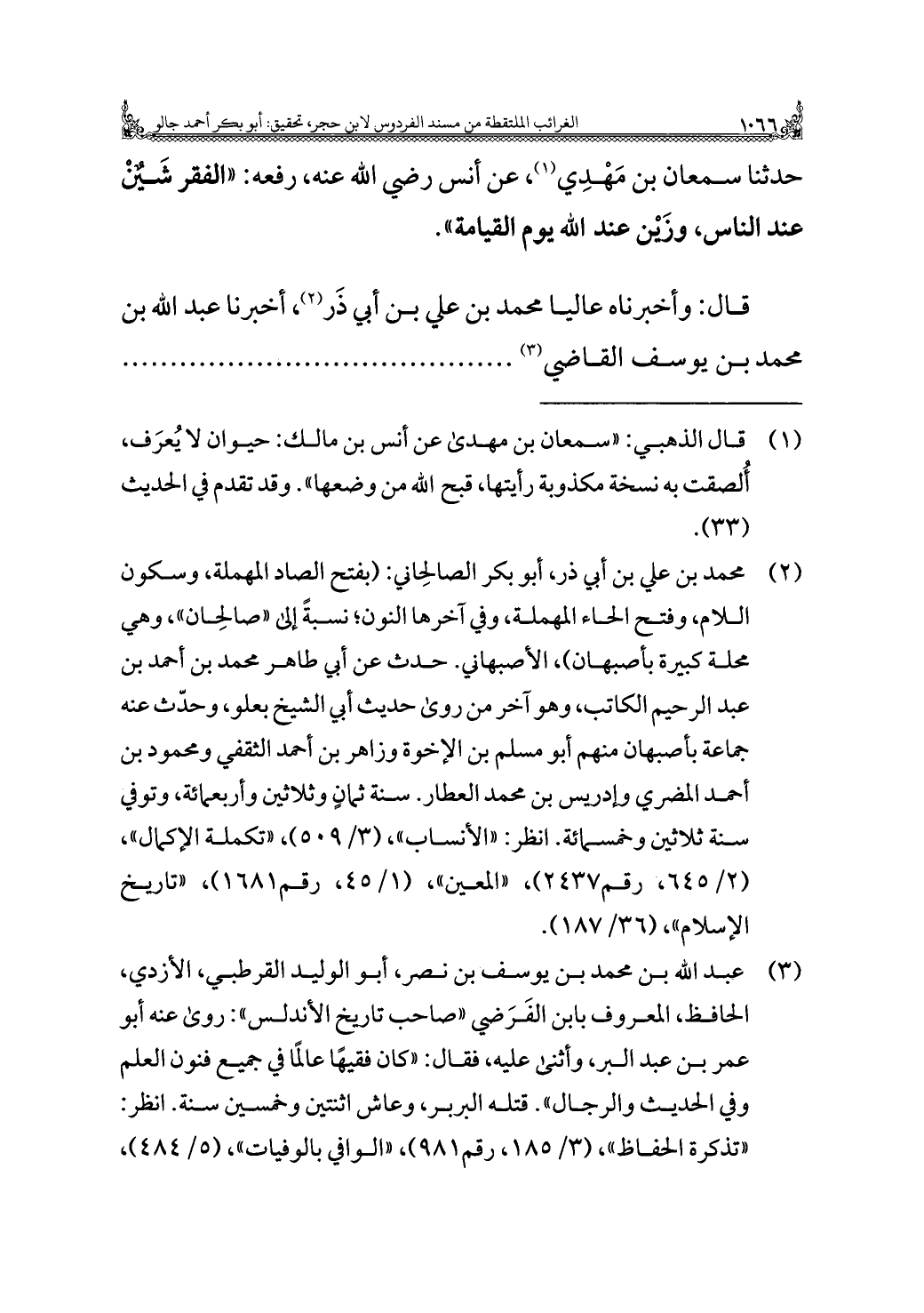(¬٣) عبد الله بن محمد بن يوسف بن نصر، أبو الوليد القرطبي، الأزدي، الحافظ، المعروف بابن الفَرَضي "صاحب تاريخ الأندلس": روى عنه أبو عمر بن عبد البر، وأثنى عليه، فقال: "كان فقيهًا عالمًا في جميع فنون العلم وفي الحديث والرجال". قتله البربر، وعاش اثنتين وخمسين سنة. انظر: "تذكرة الحفاظ"، (٣/ ١٨٥، رقم ٩٨١)، "الوافي بالوَفَيَات"، (٥/ ٤٨٤)،