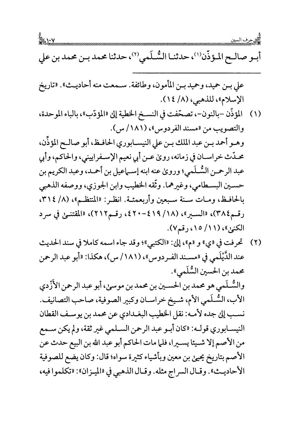 (¬٢) تحرفت في "ي" و"م"، إلى: "الكتبي"؛ وقد جاء اسمه كاملا في سند الحديث عند الدَّيْلَمي في "مسند الفردوس"، (١٨١/ س)، هكذا: "أبو عبد الرحمن محمد بن الحسين السلمي".