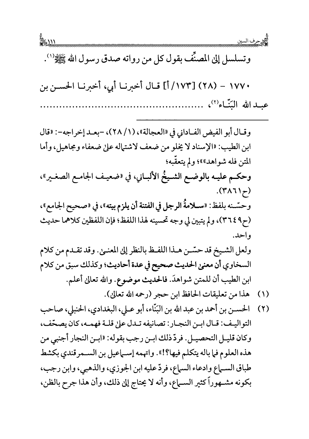 (¬٢) الحسن بن أحمد بن عبد اللَّه بن البَنّاء، أبو علي، البغدادي، الحنبلي، صاحب التواليف: قال ابن النجار: تصانيفه تدل على قلة فهمه، كان يصحّف، وكان قليل التحصيل. فردّ ذلك ابن رجب بقوله: "ابن النجار أجنبي من هذه العلوم فما باله يتكلم فيها؟ ! ". واتهمه إسماعيل بن السمرقندي بكشط طباق السماع وادعاء السماع، فردّ عليه ابن الجوزي، والذهبي، وابن رجب، بكونه مشهورًا كثير السماع، وأنه لا يحتاج إلى ذلك، وأن هذا جرح بالظن، =