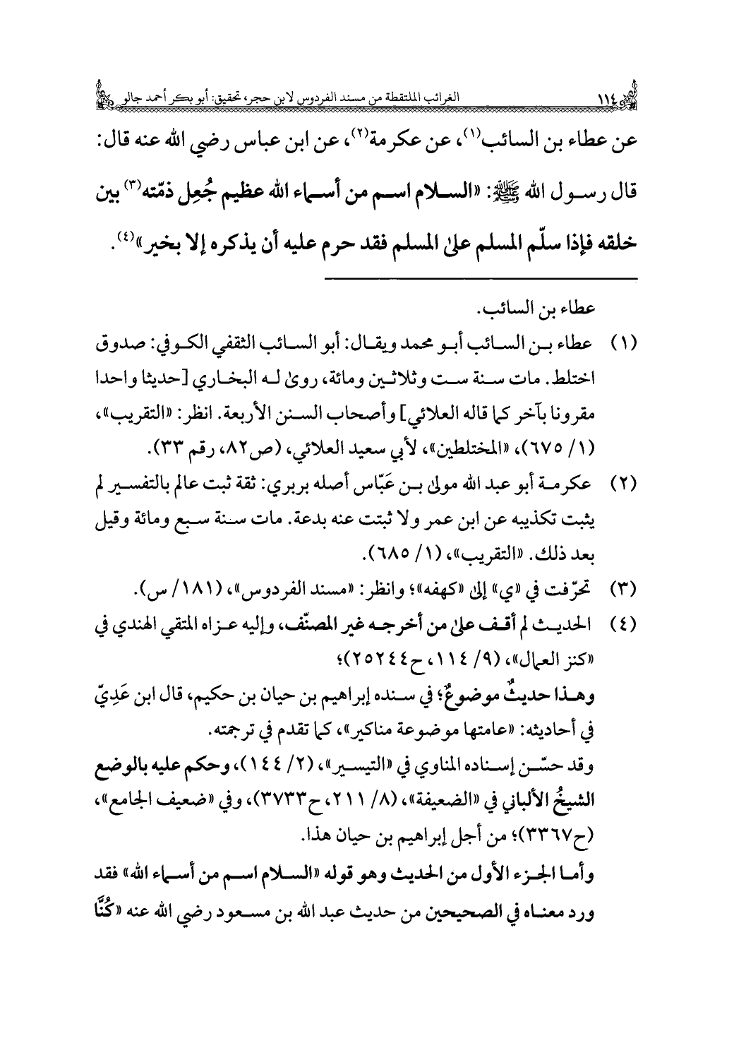 عن عطاء بن السائب (¬١)، عن عكرمة (¬٢)، عن ابن عباس رضي اللَّه عنه قال: قال رسول اللَّه -صلى اللَّه عليه وسلم-: "السلام اسم من أسماء اللَّه عظيم جُعِل ذمّته (¬٣) بين خلقه فإذا سلّم المسلم على المسلم فقد حرم عليه أن يذكره إلا بخير" (¬٤).