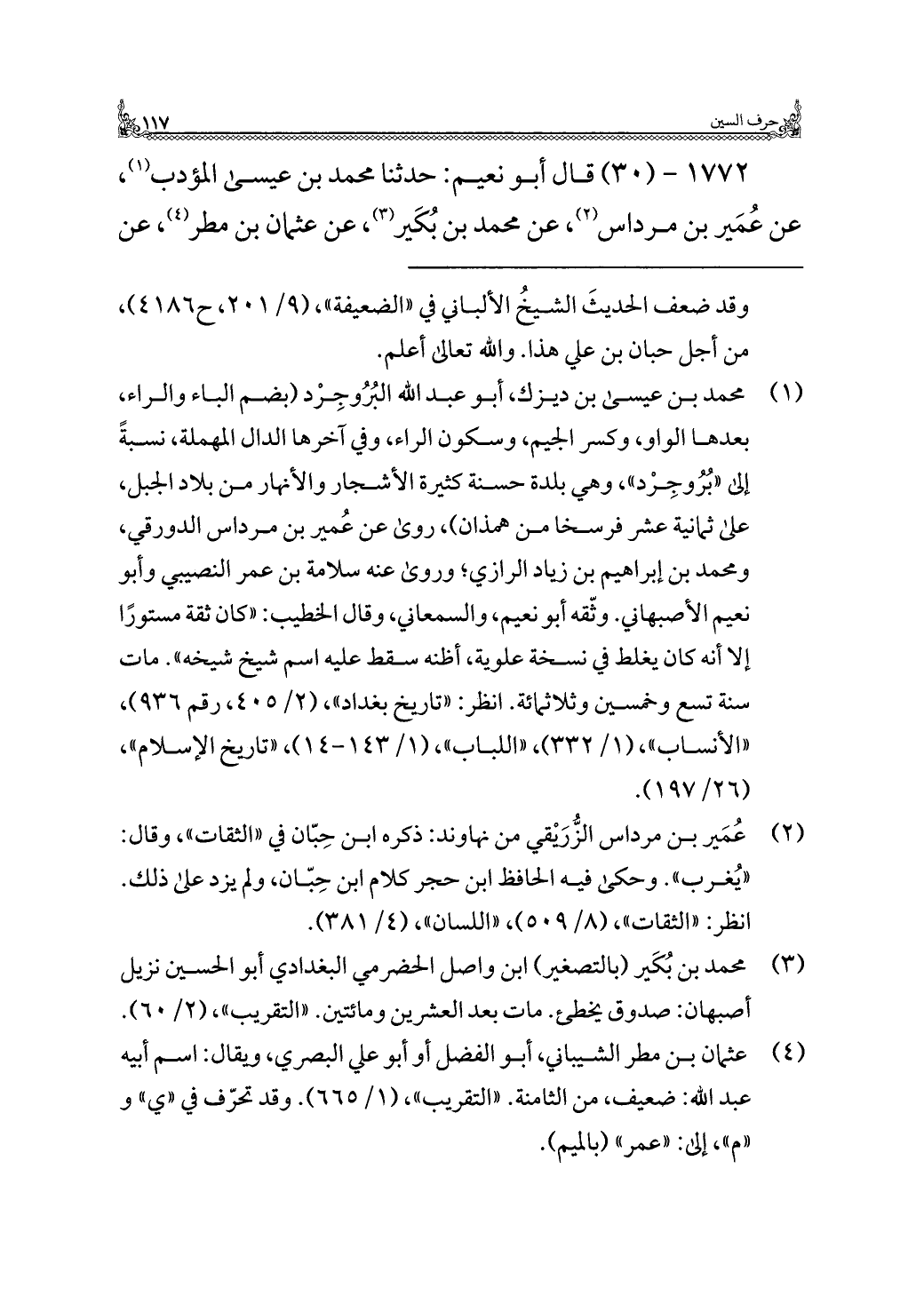 ١٧٧٢ - (٣٠) قال أبو نعيم: حدثنا محمد بن عيسى المؤدب (¬١)، عن عُمَير بن مِرْدَاس (¬٢)، عن محمد بن بُكَير (¬٣)، عن عثمان بن مطر (¬٤)، عن