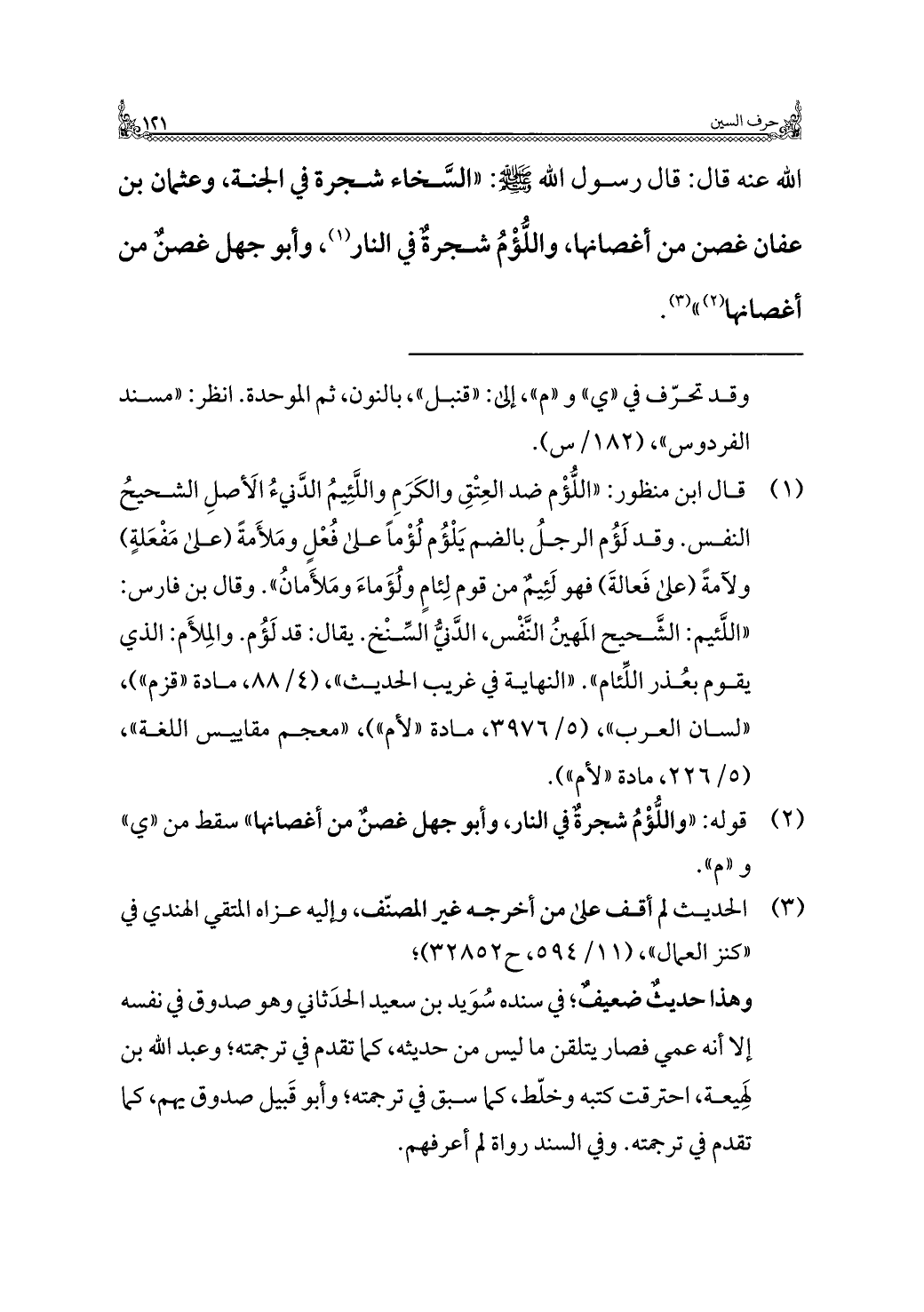 اللَّه عنه قال: قال رسول اللَّه -صلى اللَّه عليه وسلم-: "السَّخاء شجرة في الجنة، وعثمان بن عفان غصن من أغصانها، واللُّؤْمُ شجرةٌ في النار (¬١)، وأبو جهل غصنٌ من أغصانها (¬٢) " (¬٣).