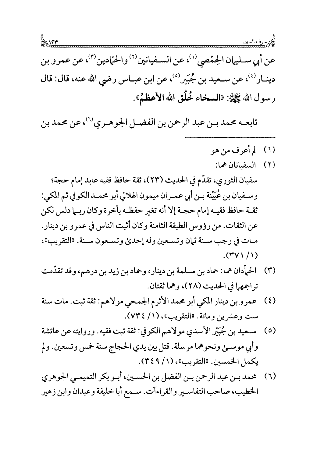 عن أبي سليمان الحِمْصي (¬١)، عن السفيانين (¬٢) والحمّادين (¬٣)، عن عمرو بن دينار (¬٤)، عن سعيد بن جُبَير (¬٥)، عن ابن عباس رضي اللَّه عنه، قال: قال رسول اللَّه -صلى اللَّه عليه وسلم-: "السخاء خُلُق اللَّه الأعظمُ".