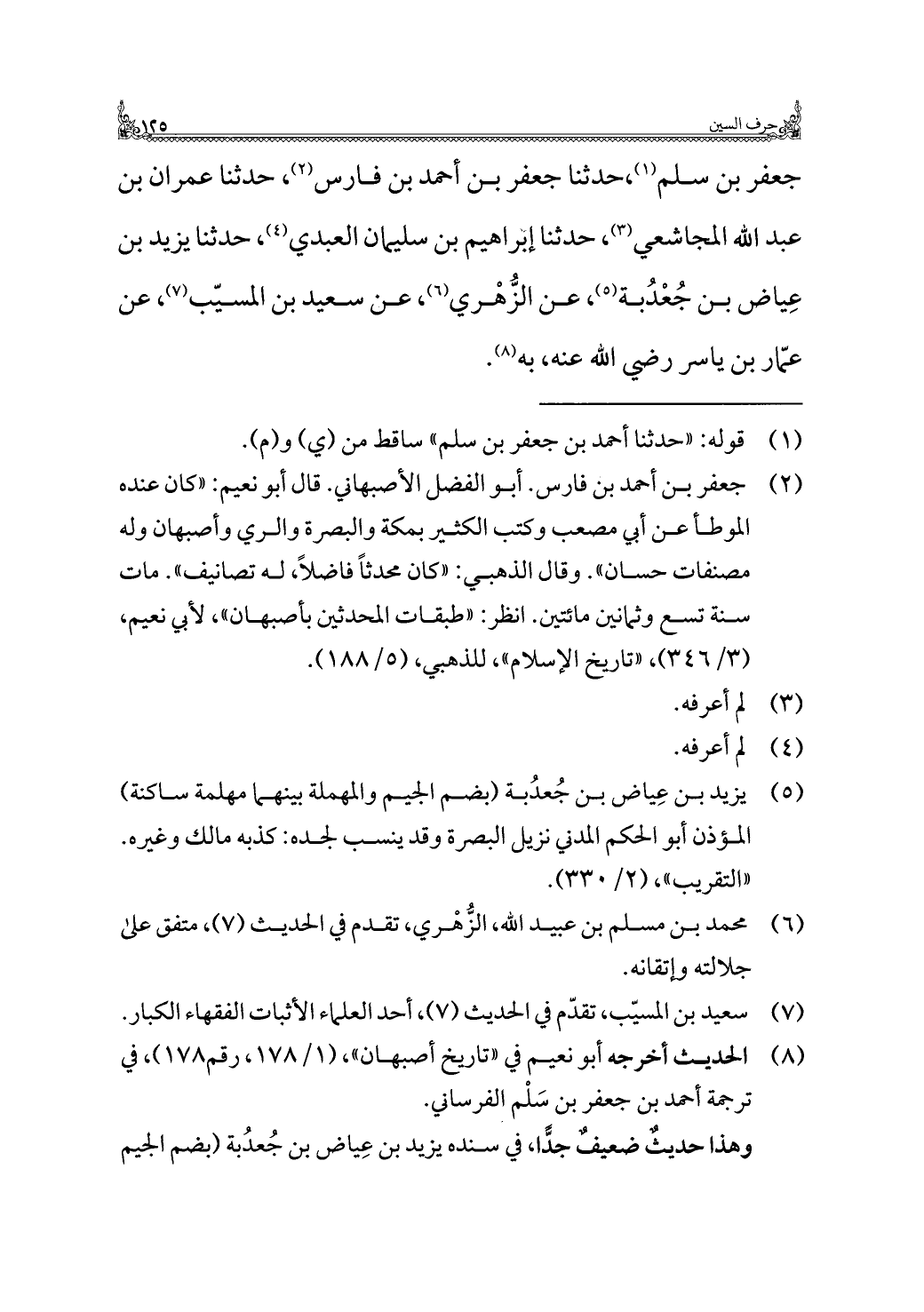 جعفر بن سلم (¬١)، حدثنا جعفر بن أحمد بن فارس (¬٢)، حدثنا عمران بن عبد اللَّه المجاشعي (¬٣)، حدثنا إبراهيم بن سليمان العبدي (¬٤)، حدثنا يزيد بن عِياض بن جُعْدُبة (¬٥)، عن الزُّهْري (¬٦)، عن سعيد بن المسيّب (¬٧)، عن عمّار بن ياسر رضي اللَّه عنه، به (¬٨).