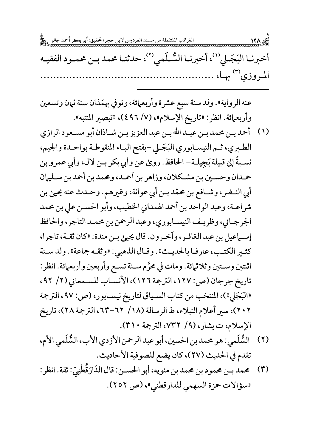 (¬١) أحمد بن محمد بن عبد اللَّه بن عبد العزيز بن شاذان أبو مسعود الرازي الطبري، ثم النيسابوري البَجَلي -بفتح الباء المنقوطة بواحدة والجيم، نسبةً إلى قبيلة بَجِيلة- الحافظ. روى عن أبي بكر بن لال، وأبي عمرو بن حمدان وحسين بن مشكلان، وزاهر بن أحمد، ومحمد بن أحمد بن سليمان أبي النضر، وشافع بن محمّد بن أبي عوانة، وغيرهم. وحدث عنه يحيى بن شراعة، وعبد الواحد بن أحمد الهمداني الخطيب، وأبو الحسن علي بن محمد الجرجاني، وظريف النيسابوري، وعبد الرحمن بن محمد التاجر، والحافظ إسماعيل بن عبد الغافر، وآخرون. قال يحيى بن مندة: "كان ثقة، تاجرًا، كثير الكتب، عارفا بالحديث". وقال الذهبي: "وثقه جماعة". ولد سنة اثنتين وستين وثلاثمائة. ومات في محرَّم سنة تسع وأربعين وأربعمائة. انظر: تاريخ جرجان (ص: ١٢٧، الترجمة ١٢٦)، الأنساب للسمعاني (٢/ ٩٢، "البَجَلي")، المنتخب من كتاب السياق لتاريخ نيسابور، (ص: ٩٧، الترجمة ٢٠٢)، سير أعلام النبلاء، ط الرسالة (١٨/ ٦٢ - ٦٣، الترجمة ٢٨)، تاريخ الإسلام، ت بشار، (٩/ ٧٣٢، الترجمة ٣١٠).