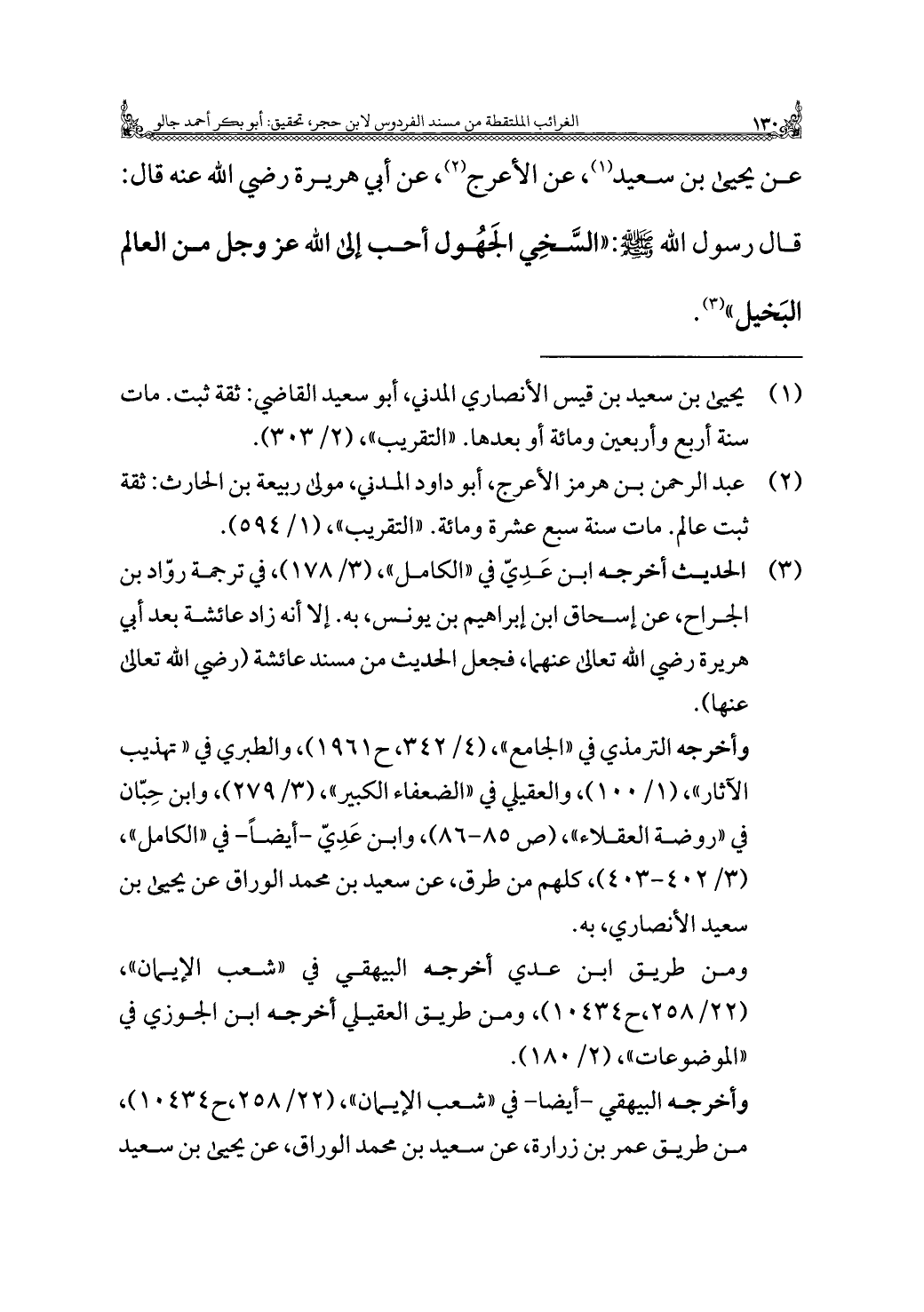 عن يحيى بن سعيد (¬١)، عن الأعرج (¬٢)، عن أبي هريرة رضي اللَّه عنه قال: قال رسول اللَّه -صلى اللَّه عليه وسلم-: "السَّخِي الجَهُول أحب إلى اللَّه عزَّ وجلَّ من العالم البَخيل" (¬٣).