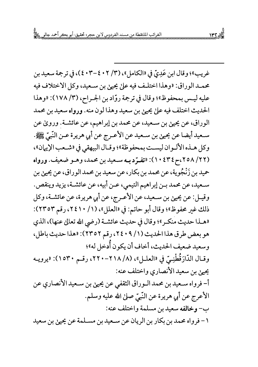 = غريب"، وقال ابن عَدِيّ في "الكامل"، (٣/ ٤٠٢ - ٤٠٣)، في ترجمة سعيد بن محمد الوراق: "وهذا اختلف فيه على يحيى بن سعيد، وكل الاختلاف فيه عليه ليس بمحفوظ"، وقال في ترجمة روّاد بن الجراح، (٣/ ١٧٨): "وهذا الحديث اختلف فيه على يحيى بن سعيد وهذا لون منه. ورواه سعيد بن محمد الوراق، عن يحيى بن سعيد، عن محمد بن إبراهيم، عن عائشة. وروى عن سعيد أيضًا عن يحيى بن سعيد عن الأعرج عن أبي هريرة عن النّبيّ -صلى اللَّه عليه وسلم-. وكل هذه الألوان ليست بمحفوظة"، وقال البيهقي في "شعب الإيمان"، (٢٢/ ٢٥٨، ح ١٠٤٣٤): "تفرّد به سعيد بن محمد، وهو ضعيف. ورواه حميد بن زَنْجُوية، عن محمد بن بكار، عن سعيد بن محمد الوراق، عن يحيى بن سعيد، عن محمد بن إبراهيم التيمي، عن أبيه، عن عائشة، يزيد وينقص. وقيل: عن يحيى بن سعيد، عن الأعرج، عن أبي هريرة، عن عائشة، وكل ذلك غير محفوظ"، وقال أبو حاتم: في "العلل"، (١/ ٢٤١٠، رقم ٢٣٥٣): "هذا حديث منكر"، وقال في حديث عائشة (رضي اللَّه تعالى عنها)، الذي هو بعض طرق هذا الحديث (١/ ٢٤٠٩، رقم ٢٣٥٢): "هذا حديث باطل، وسعيد ضعيف الحديث، أخاف أن يكون أُدخل له"؛