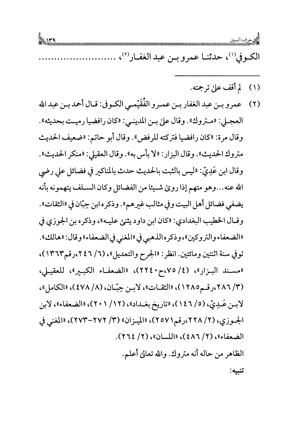 (¬٢) عمرو بن عبد الغفار بن عمرو الفُقَيْمي الكوفى: قال أحمد بن عبد اللَّه العجلي: "متروك". وقال على بن المديني: "كان رافضيا رميت بحديثه". وقال مرة: "كان رافضيا فتركته للرفض". وقال أبو حاتم: "ضعيف الحديث متروك الحديث". وقال البزار: "لا بأس به". وقال العقيلي: "منكر الحديث". وقال ابن عَدِيّ: "ليس بالثبت بالحديث حدث بالمناكير في فضائل علي رضي اللَّه عنه. . . وهو متهم إذا روى شيئًا من الفضائل وكان السلف يتهمونه بأنه يضفي فضائل أهل البيت وفي مثالب غيرهم". وذكره ابن حِبّان في "الثقات". وقال الخطيب البغدادي: "كان ابن داود يثنى عليه"، وذكره بن الجوزي في "الضعفاء والمتروكين"، وذكره الذهبي في "المغني في الضعفاء" وقال: "هالك". توفي سنة اثنتين ومائتين. انظر: "الجرح والتعديل"، (٦/ ٢٤٦، رقم ١٣٦٣)، "مسند البزار"، (٤/ ٧٥، ح ٢٢٤٠)، "الضعفاء الكبير"، للعقيلي، (٣/ ٢٨٦، رقم ١٢٨٥)، "الثقات"، لابن حِبّان، (٨/ ٤٧٨)، "الكامل"، لابن عَدِيّ، (٥/ ١٤٦)، "تاريخ بغداد"، (١٢/ ٢٥١)، "الضعفاء"، لابن الجوزي، (٢/ ٢٢٨، رقم ٢٥٧١)، "الميزان" (٣/ ٢٧٢ - ٢٧٣)، "المغني في الضعفاء"، (٢/ ٤٨٦)، "اللسان"، (٢/ ٢٦٤).