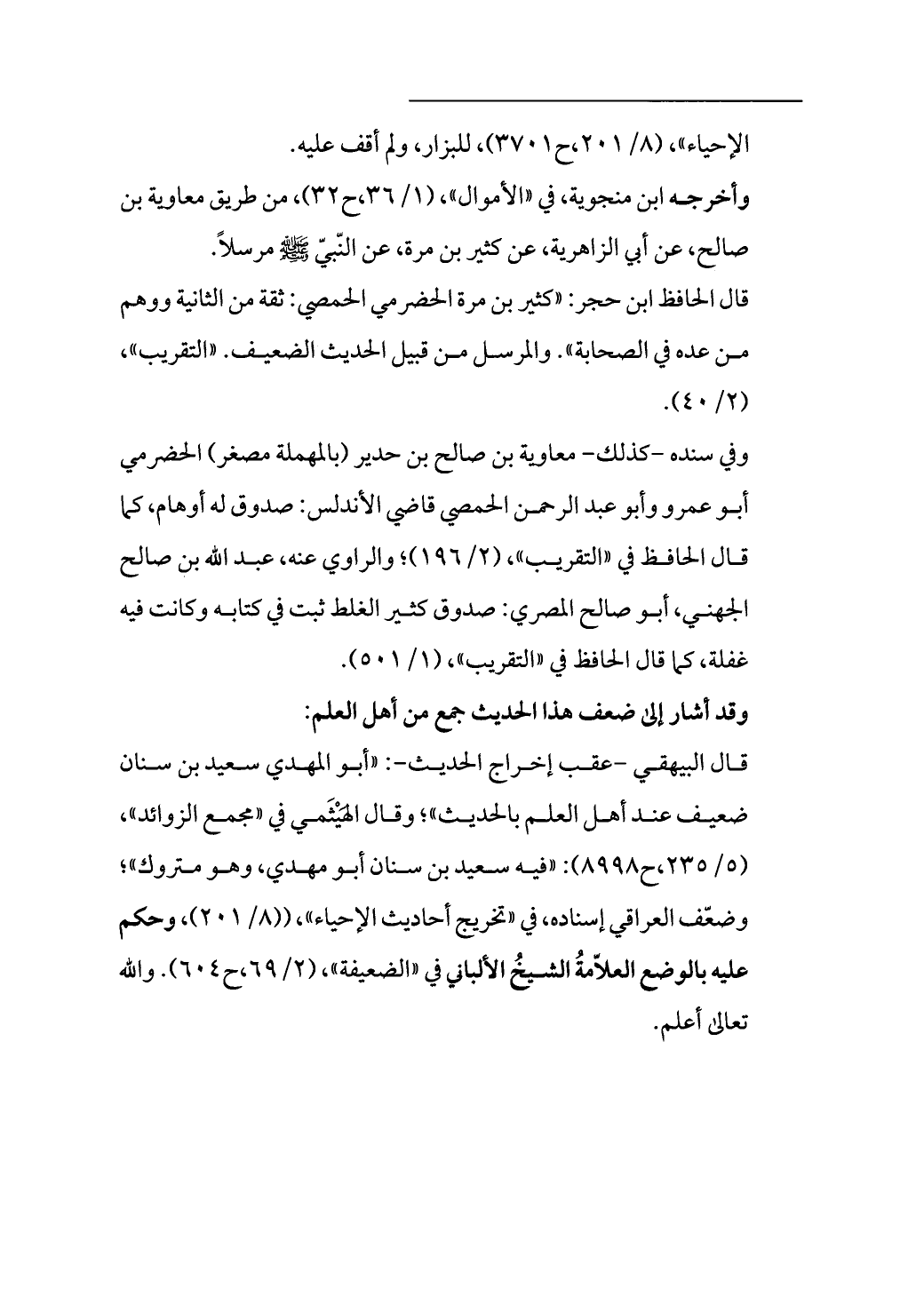 وأخرجه ابن منجوية، في "الأموال"، (١/ ٣٦، ح ٣٢)، من طريق معاوية بن صالح، عن أبي الزاهرية، عن كثير بن مرة، عن النّبيّ -صلى اللَّه عليه وسلم- مرسلًا.