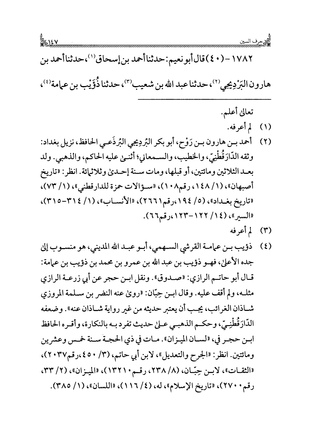 (¬٢) أحمد بن هارون بن رَوْح، أبو بكر البَرْدِيجي البَرْذَعي الحافظ، نزيل بغداد: وثقه الدّارَقُطْنِيّ، والخطيب، والسمعاني؛ أثنى عليه الحاكم، والذهبي. ولد بعد الثلاثين ومائتين، أو قبلها، ومات سنة إحدى وثلاثمائة. انظر: "تاريخ أصبهان"، (١/ ١٤٨، رقم ١٠٨)، "سؤالات حمزة للدارقطني"، (١/ ٧٣)، "تاريخ بغداد"، (٥/ ١٩٤، رقم ٢٦٦١)، "الأنساب" (١/ ٣١٤ - ٣١٥)، "السير"، (١٤/ ١٢٢ - ١٢٣، رقم ٦٦).