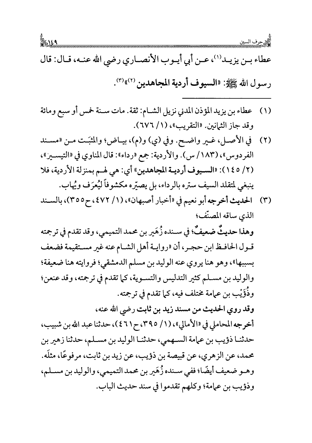 عطاء بن يزيد (¬١)، عن أبي أيوب الأنصاري رضي اللَّه عنه، قال: قال رسول اللَّه -صلى اللَّه عليه وسلم-: "السيوف أردية المجاهدين (¬٢) " (¬٣).
