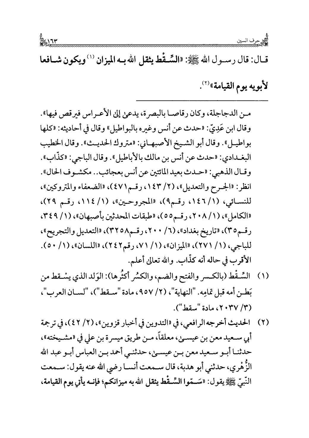 (¬٢) الحديث أخرجه الرافعي، في "التدوين في أخبار قزوين"، (٢/ ٤٢)، في ترجمة أبي سعيد معن بن عيسى، معلقا، من طريق ميسرة بن علي في "مشيخته"، حدثنا أبو سعيد معن بن عيسى، حدثني أحمد بن العباس أبو عبد اللَّه الزُّهْري، حدثني أبو هدبة، قال سمعت أنسا رضي اللَّه عنه يقول: سمعت النّبيّ -صلى اللَّه عليه وسلم- يقول: "سَمّوا السِّقْط يثقل اللَّه به ميزانكم؛ فإنه يأتي يوم القيامة، =