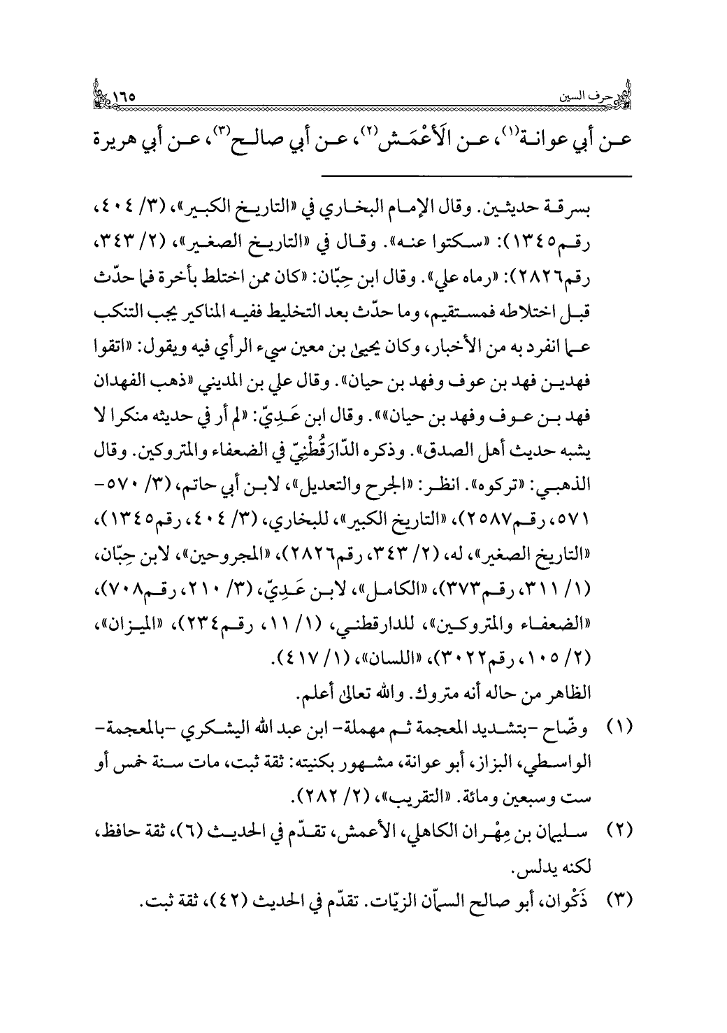 (¬١) وضّاح -بتشديد المعجمة ثم مهملة- ابن عبد اللَّه اليشكري -بالمعجمة- الواسطي، البزاز، أبو عوانة، مشهور بكنيته: ثقة ثبت، مات سنة خمس أو ست وسبعين ومائة. "التقريب"، (٢/ ٢٨٢).