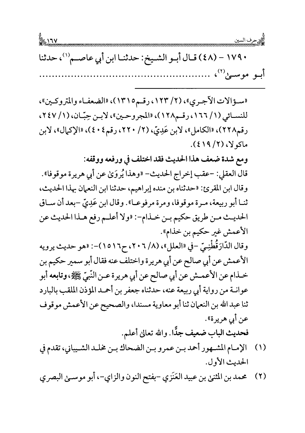 وقال الدّارَقُطْنِيّ -في "العلل"، (٨/ ٢٠٦، ح ١٥١٦) -: "هو حديث يرويه الأعمش عن أبي صالح عن أبي هريرة واختلف عنه فقال أبو سمير حكيم بن خذام عن الأعمش عن أبي صالح عن أبي هريرة عن النّبيّ -صلى اللَّه عليه وسلم-، وتابعه أبو عوانة من رواية أبي ربيعة عنه، حدثناه جعفر بن أحمد المؤذن الملقب بالبارد ثنا عبد اللَّه بن النعمان ثنا أبو معاوية مسندا، والصحيح عن الأعمش موقوف عن أبي هريرة".