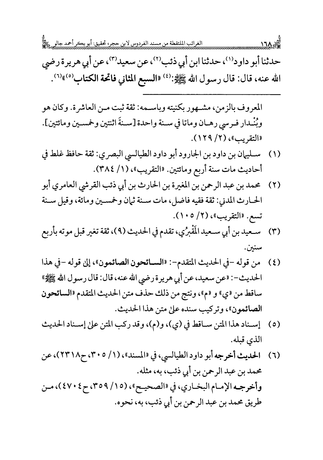 حدثنا أبو داود (¬١)، حدثنا ابن أبي ذئب (¬٢)، عن سعيد (¬٣)، عن أبي هريرة رضي اللَّه عنه، قال: قال رسول اللَّه -صلى اللَّه عليه وسلم-: (¬٤) "السبع المثاني فاتحة الكتاب (¬٥) " (¬٦).