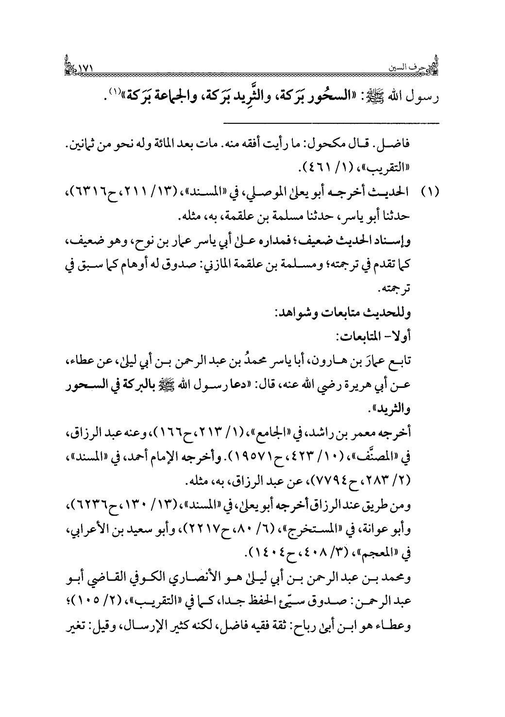 تابع عمارَ بن هارون، أبا ياسر محمدُ بن عبد الرحمن بن أبي ليلى، عن عطاء، عن أبي هريرة رضي اللَّه عنه، قال: "دعا رسول اللَّه -صلى اللَّه عليه وسلم- بالبركة في السحور والثريد".