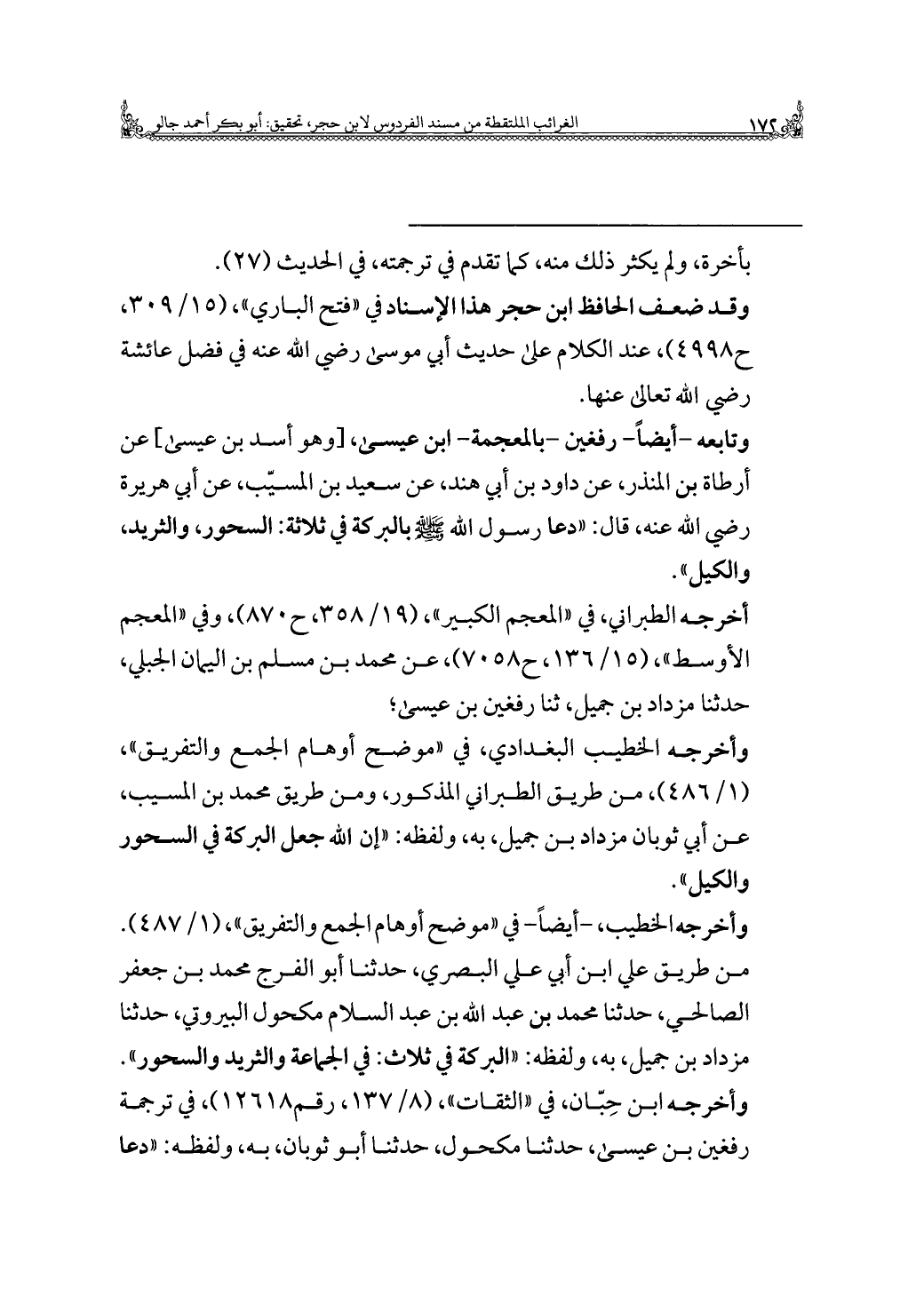 وتابعه -أيضًا- رفغين -بالمعجمة- ابن عيسى، [وهو أسد بن عيسى] عن أرطاة بن المنذر، عن داود بن أبي هند، عن سعيد بن المسيّب، عن أبي هريرة رضي اللَّه عنه، قال: "دعا رسول اللَّه -صلى اللَّه عليه وسلم- بالبركة في ثلاثة: السحور، والثريد، والكيل".