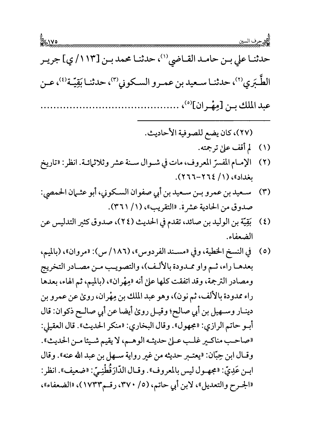 حدثنا علي بن حامد القاضي (¬١)، حدثنا محمد بن جرير الطَّبَري (¬٢)، حدثنا سعيد بن عمرو السكوني (¬٣)، حدثنا بَقِيّة (¬٤)، عن عبد الملك بن [مِهْران] (¬٥)، . . . . . . .
