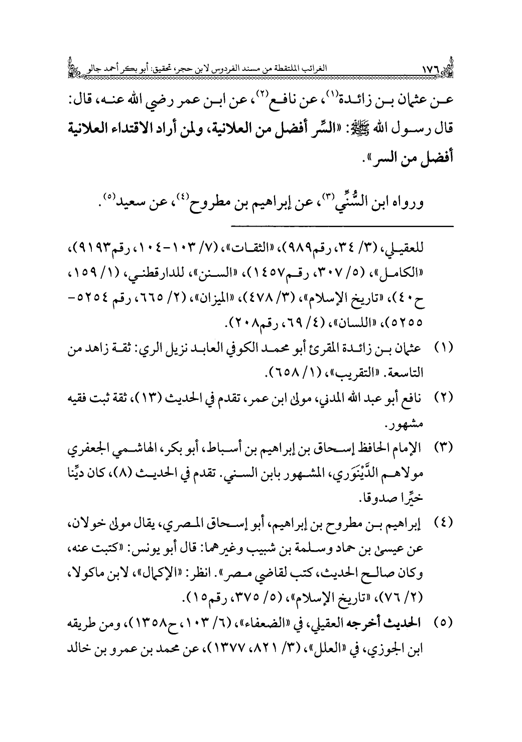 عن عثمان بن زائدة (¬١)، عن نافع (¬٢)، عن ابن عمر رضي اللَّه عنه، قال: قال رسول اللَّه -صلى اللَّه عليه وسلم-: "السِّر أفضل من العلانية، ولمن أراد الاقتداء العلانية أفضل من السر".